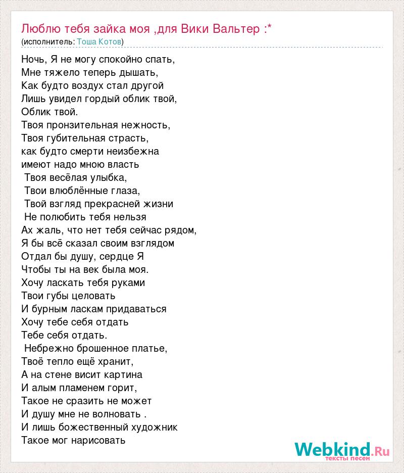 А как ты думаешь, о чем песня "Люблю тебя зайка моя ,для Вики Вальтер :*" ?