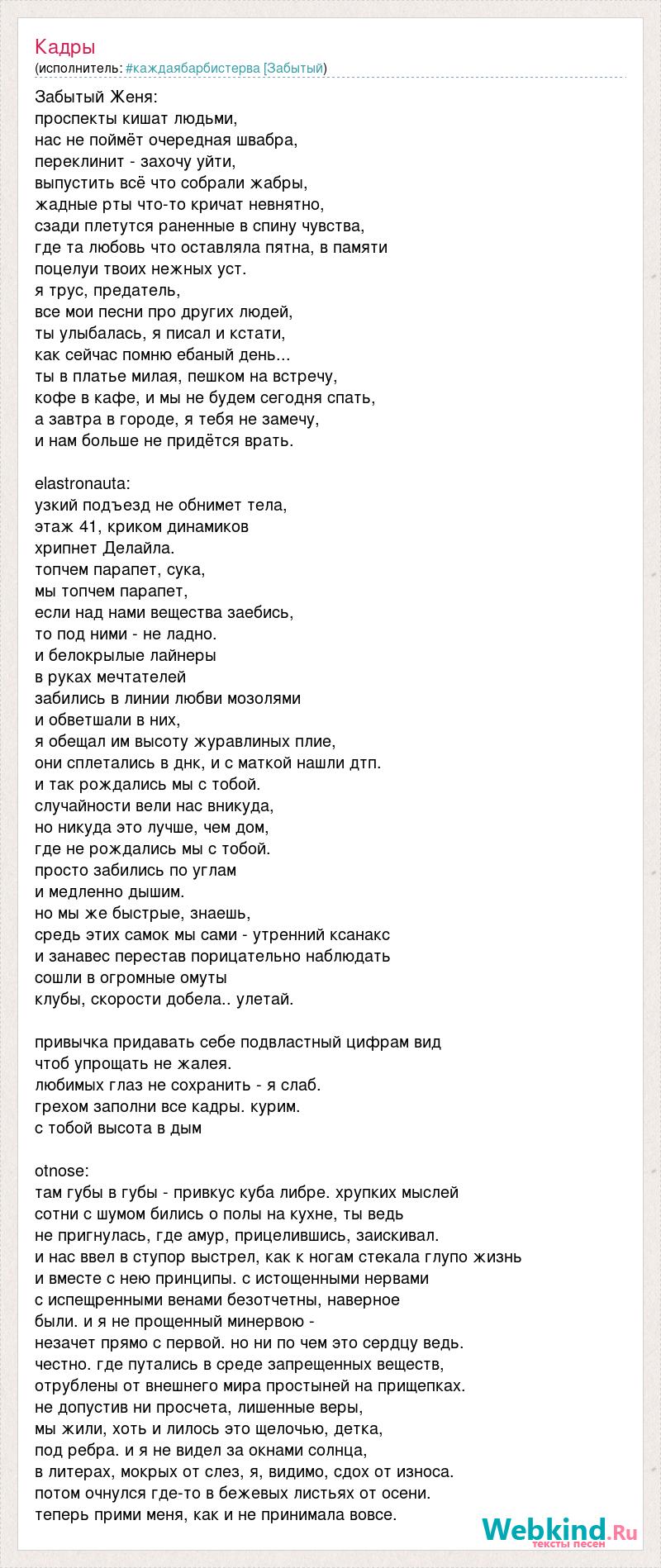 Забытый Женя: проспекты кишат людьми, нас не поймёт очередная швабра, переклинит - захочу уйти, выпустить всё что собрали жабры, жадные рты что-то кричат невнятно, сзади плетутся раненные в спину чувства, где та любовь что оставляла пятна, в памяти поцелуи твоих нежных уст. я трус, предатель, все мои песни про других людей, ты улыбалась, я писал и кстати, как сейчас помню ебаный день... ты в платье милая, пешком на встречу, кофе в кафе, и мы не будем сегодня спать, а завтра в городе, я тебя не замечу, и нам больше не придётся врать. elastronauta: узкий подъезд не обнимет тела, этаж 41, криком динамиков хрипнет Делайла. топчем парапет, сука, мы топчем парапет, если над нами вещества заебись, то под ними - не ладно. и белокрылые лайнеры в руках мечтателей забились в линии любви мозолями и обветшали в них, я обещал им высоту журавлиных плие, они сплетались в днк, и с маткой нашли дтп. и так рождались мы с тобой. случайности вели нас вникуда, но никуда это лучше, чем дом, где не рождались мы с тобой. просто забились по углам и медленно дышим. но мы же быстрые, знаешь, средь этих самок мы сами - утренний ксанакс и занавес перестав порицательно наблюдать сошли в огромные омуты клубы, скорости добела.. улетай. привычка придавать себе подвластный цифрам вид чтоб упрощать не жалея. любимых глаз не сохранить - я слаб. грехом заполни все кадры. курим. с тобой высота в дым otnose: там губы в губы - привкус куба либре. хрупких мыслей сотни с шумом бились о полы на кухне, ты ведь не пригнулась, где амур, прицелившись, заискивал. и нас ввел в ступор выстрел, как к ногам стекала глупо жизнь и вместе с нею принципы. с истощенными нервами с испещренными венами безотчетны, наверное были. и я не прощенный минервою - незачет прямо с первой. но ни по чем это сердцу ведь. честно. где путались в среде запрещенных веществ, отрублены от внешнего мира простыней на прищепках. не допустив ни просчета, лишенные веры, мы жили, хоть и лилось это щелочью, детка, под ребра. и я не видел за окнами солнца, в литерах, мокрых от слез, я, видимо, сдох от износа. потом очнулся где-то в бежевых листьях от осени. теперь прими меня, как и не принимала вовсе.