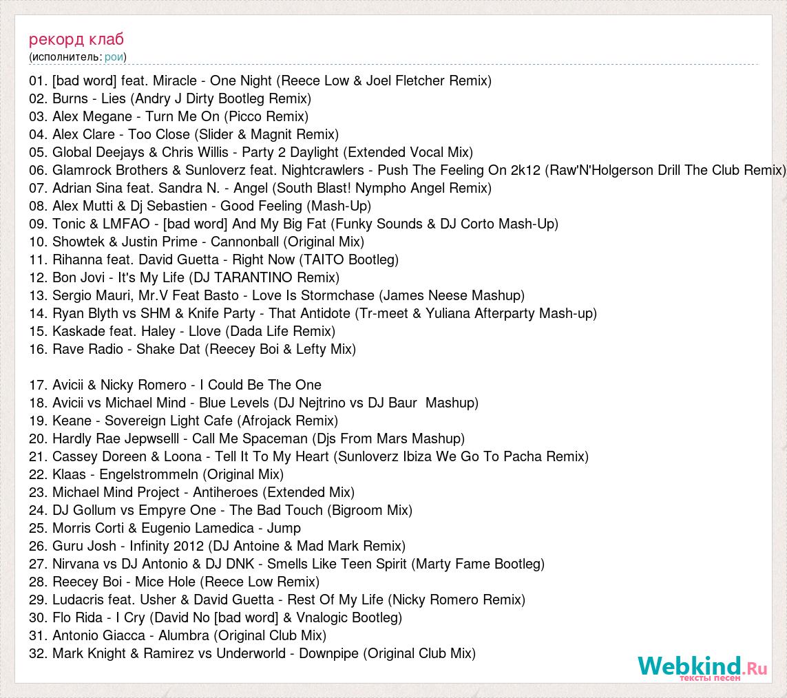 01. [bad word] feat. Miracle - One Night (Reece Low & Joel Fletcher Remix) 02. Burns - Lies (Andry J Dirty Bootleg Remix) 03. Alex Megane - Turn Me On (Picco Remix) 04. Alex Clare - Too Close (Slider & Magnit Remix) 05. Global Deejays & Chris Willis - Party 2 Daylight (Extended Vocal Mix) 06. Glamrock Brothers & Sunloverz feat. Nightcrawlers - Push The Feeling On 2k12 (Raw'N'Holgerson Drill The Club Remix) 07. Adrian Sina feat. Sandra N. - Angel (South Blast! Nympho Angel Remix) 08. Alex Mutti & Dj Sebastien - Good Feeling (Mash-Up) 09. Tonic & LMFAO - [bad word] And My Big Fat (Funky Sounds & DJ Corto Mash-Up) 10. Showtek & Justin Prime - Cannonball (Original Mix) 11. Rihanna feat. David Guetta - Right Now (TAITO Bootleg) 12. Bon Jovi - It's My Life (DJ TARANTINO Remix) 13. Sergio Mauri, Mr.V Feat Basto - Love Is Stormchase (James Neese Mashup) 14. Ryan Blyth vs SHM & Knife Party - That Antidote (Tr-meet & Yuliana Afterparty Mash-up) 15. Kaskade feat. Haley - Llove (Dada Life Remix) 16. Rave Radio - Shake Dat (Reecey Boi & Lefty Mix) 17. Avicii & Nicky Romero - I Could Be The One 18. Avicii vs Michael Mind - Blue Levels (DJ Nejtrino vs DJ Baur Mashup) 19. Keane - Sovereign Light Cafe (Afrojack Remix) 20. Hardly Rae Jepwselll - Call Me Spaceman (Djs From Mars Mashup) 21. Cassey Doreen & Loona - Tell It To My Heart (Sunloverz Ibiza We Go To Pacha Remix) 22. Klaas - Engelstrommeln (Original Mix) 23. Michael Mind Project - Antiheroes (Extended Mix) 24. DJ Gollum vs Empyre One - The Bad Touch (Bigroom Mix) 25. Morris Corti & Eugenio Lamedica - Jump 26. Guru Josh - Infinity 2012 (DJ Antoine & Mad Mark Remix) 27. Nirvana vs DJ Antonio & DJ DNK - Smells Like Teen Spirit (Marty Fame Bootleg) 28. Reecey Boi - Mice Hole (Reece Low Remix) 29. Ludacris feat. Usher & David Guetta - Rest Of My Life (Nicky Romero Remix) 30. Flo Rida - I Cry (David No [bad word] & Vnalogic Bootleg) 31. Antonio Giacca - Alumbra (Original Club Mix) 32. Mark Knight & Ramirez vs Underworld - Downpipe (Original Club Mix)