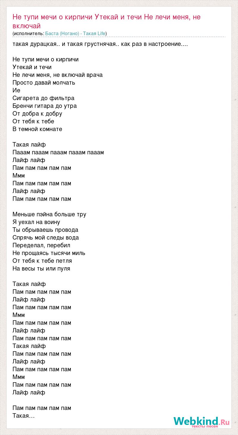 такая дурацкая.. и такая грустнячая.. как раз в настроение.... Не тупи мечи о кирпичи Утекай и течи Не лечи меня, не включай врача Просто давай молчать Ие Сигарета до фильтра Бренчи гитара до утра От добра к добру От тебя к тебе В темной комнате Такая лайф Пааам пааам пааам пааам пааам Лайф лайф Пам пам пам пам пам Ммм Пам пам пам пам пам Лайф лайф Пам пам пам пам пам Меньше пэйна больше тру Я уехал на воину Ты обрываешь провода Спрячь мой следы вода Переделал, перебил Не прощаясь тысячи миль От тебя к тебе петля На весы ты или пуля Такая лайф Пам пам пам пам пам Лайф лайф Пам пам пам пам пам Ммм Пам пам пам пам пам Лайф лайф Пам пам пам пам пам Такая лайф Пам пам пам пам пам Лайф лайф Пам пам пам пам пам Ммм Пам пам пам пам пам Лайф лайф Пам пам пам пам пам Такая…
