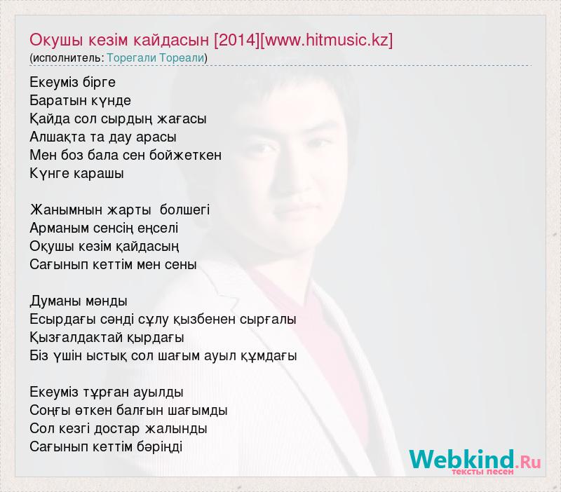 Екеуміз бірге Баратын күнде Қайда сол сырдың жағасы Алшақта та дау арасы Мен боз бала сен бойжеткен Күнге карашы Жанымнын жарты болшегі Арманым сенсің еңселі Оқушы кезім қайдасың Сағынып кеттім мен сены Думаны мәнды Есырдағы сәнді сұлу қызбенен сырғалы Қызғалдактай қырдағы Біз үшін ыстық сол шағым ауыл құмдағы Екеуміз тұрған ауылды Соңғы өткен балғын шағымды Сол кезгі достар жалынды Сағынып кеттім бәріңді