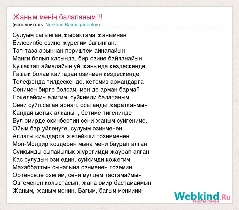 Сулуым сагынган,жырактама жанымнан Билесинбе озине журегим багынган. Тап-таза арыннан периштем айналайын Манги болып касында, бир озине байланайын Кушактап аймалайын уй жанында кездескенде, Гашык болам кайтадан озинмен кездескенде Телефонда тилдескенде, кетемиз армандарга Сенимен бирге болсам, мен де арман барма? Еркелейсин елигим, суйкимди балапаным Сени суйп,саган арнап, осы анды жаратканмын Кандай ыстык алканын, бетиме тигенинде Бул омирде окинбеспин сени жаным суйгениме, Ойым бар уйленуге, сулуым озинменен Алдагы киалдарга жетейкши тозимменен Моп-Молдир коздерин мына мени баурап алган Суйкымды сыпайылык журегимди жаурап алган Кас сулудын ози един, суйкимди кожегим Махаббаттын сынагына ознменен тоземин Ортенседе озегим, сени мулдем тастамаймын Озгеменен колыстасып, жана омир бастамаймын Жаным, жаным менин, Багым, багым мениииин