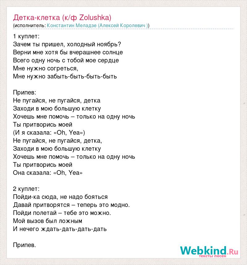 1 куплет: Зачем ты пришел, холодный ноябрь? Верни мне хотя бы вчерашнее солнце Всего одну ночь с тобой мое сердце Мне нужно согреться, Мне нужно забыть-быть-быть-быть Припев: Не пугайся, не пугайся, детка Заходи в мою большую клетку Хочешь мне помочь – только на одну ночь Ты притворись моей (И я сказала: «Oh, Yea») Не пугайся, не пугайся, детка, Заходи в мою большую клетку Хочешь мне помочь – только на одну ночь Ты притворись моей Она сказала: «Oh, Yea» 2 куплет: Пойди-ка сюда, не надо бояться Давай притворятся – теперь это модно. Пойди полетай – тебе это можно. Мой вызов был ложным И нечего ждать-дать-дать-дать Припев.