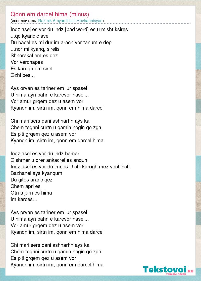 Indz asel es vor du indz [bad word] es u misht ksires ...qo kyanqic aveli Du bacel es mi dur im arach vor tanum e depi ...nor mi kyanq, sirelis Shnorakal em es qez Vor verchapes Es karogh em sirel Gzhi pes... Ays orvan es tariner em lur spasel U hima ayn pahn e karevor hasel... Vor amur grqem qez u asem vor Kyanqn im, sirtn im, qonn em hima darcel Chi mari sers qani ashharhn ays ka Chem toghni curtn u qamin hogin qo zga Es piti grqem qez u asem vor Kyanqn im, sirtn im, qonn em darcel hima Indz asel es vor du indz hamar Gishrner u orer ankacrel es anqun Indz asel es vor du imnes U chi karogh mez vochinch Bazhanel ays kyanqum Du gites aranc qez Chem apri es Otn u jurn es hima Im karces... Ays orvan es tariner em lur spasel U hima ayn pahn e karevor hasel... Vor amur grqem qez u asem vor Kyanqn im, sirtn im, qonn em hima darcel Chi mari sers qani ashharhn ays ka Chem toghni curtn u qamin hogin qo zga Es piti grqem qez u asem vor Kyanqn im, sirtn im, qonn em darcel hima