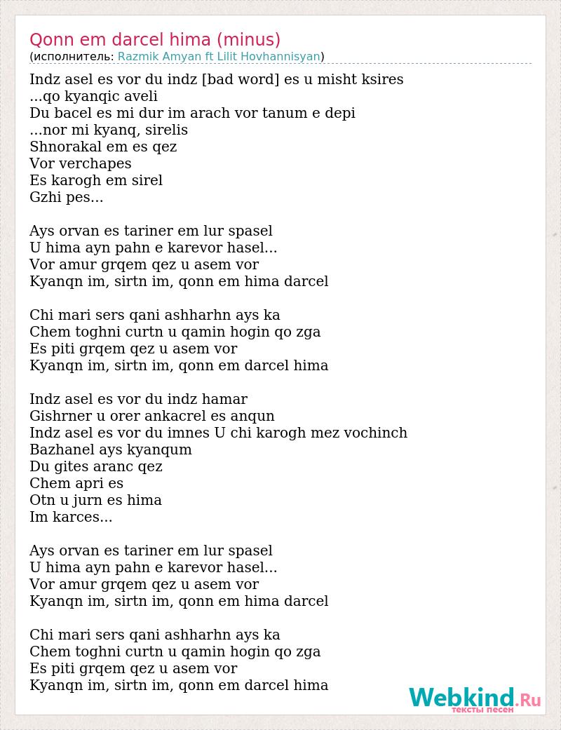 Indz asel es vor du indz [bad word] es u misht ksires ...qo kyanqic aveli Du bacel es mi dur im arach vor tanum e depi ...nor mi kyanq, sirelis Shnorakal em es qez Vor verchapes Es karogh em sirel Gzhi pes... Ays orvan es tariner em lur spasel U hima ayn pahn e karevor hasel... Vor amur grqem qez u asem vor Kyanqn im, sirtn im, qonn em hima darcel Chi mari sers qani ashharhn ays ka Chem toghni curtn u qamin hogin qo zga Es piti grqem qez u asem vor Kyanqn im, sirtn im, qonn em darcel hima Indz asel es vor du indz hamar Gishrner u orer ankacrel es anqun Indz asel es vor du imnes U chi karogh mez vochinch Bazhanel ays kyanqum Du gites aranc qez Chem apri es Otn u jurn es hima Im karces... Ays orvan es tariner em lur spasel U hima ayn pahn e karevor hasel... Vor amur grqem qez u asem vor Kyanqn im, sirtn im, qonn em hima darcel Chi mari sers qani ashharhn ays ka Chem toghni curtn u qamin hogin qo zga Es piti grqem qez u asem vor Kyanqn im, sirtn im, qonn em darcel hima