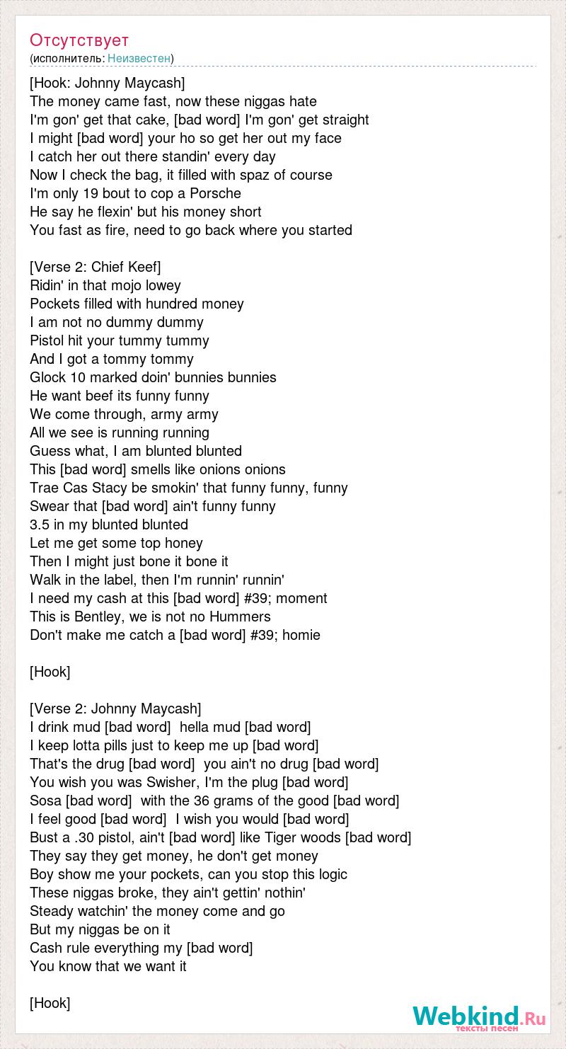 [Hook: Johnny Maycash] The money came fast, now these niggas hate I'm gon' get that cake, [bad word] I'm gon' get straight I might [bad word] your ho so get her out my face I catch her out there standin' every day Now I check the bag, it filled with spaz of course I'm only 19 bout to cop a Porsche He say he flexin' but his money short You fast as fire, need to go back where you started [Verse 2: Chief Keef] Ridin' in that mojo lowey Pockets filled with hundred money I am not no dummy dummy Pistol hit your tummy tummy And I got a tommy tommy Glock 10 marked doin' bunnies bunnies He want beef its funny funny We come through, army army All we see is running running Guess what, I am blunted blunted This [bad word] smells like onions onions Trae Cas Stacy be smokin' that funny funny, funny Swear that [bad word] ain't funny funny 3.5 in my blunted blunted Let me get some top honey Then I might just bone it bone it Walk in the label, then I'm runnin' runnin' I need my cash at this [bad word] #39; moment This is Bentley, we is not no Hummers Don't make me catch a [bad word] #39; homie [Hook] [Verse 2: Johnny Maycash] I drink mud [bad word] hella mud [bad word] I keep lotta pills just to keep me up [bad word] That's the drug [bad word] you ain't no drug [bad word] You wish you was Swisher, I'm the plug [bad word] Sosa [bad word] with the 36 grams of the good [bad word] I feel good [bad word] I wish you would [bad word] Bust a .30 pistol, ain't [bad word] like Tiger woods [bad word] They say they get money, he don't get money Boy show me your pockets, can you stop this logic These niggas broke, they ain't gettin' nothin' Steady watchin' the money come and go But my niggas be on it Cash rule everything my [bad word] You know that we want it [Hook]