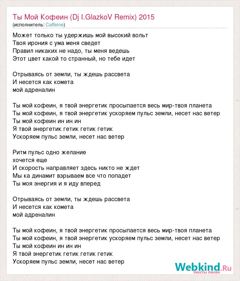 Может только ты удержишь мой высокий вольт Твоя ирония с ума меня сведет Правил никаких не надо, ты меня ведешь Этот цвет какой то странный, но тебе идет Отрываясь от земли, ты ждешь рассвета И несется как комета мой адреналин Ты мой кофеин, я твой энергетик просыпается весь мир-твоя планета Ты мой кофеин, я твой энергетик ускоряем пульс земли, несет нас ветер Ты мой кофеин ин ин ин Я твой энергетик гетик гетик гетик Ускоряем пульс земли, несет нас ветер Ритм пульс одно желание хочется еще И скорость направляет здесь никто не ждет Мы ка динамит взрываем все что попадет Ты моя энергия и я иду вперед Отрываясь от земли, ты ждешь рассвета И несется как комета мой адреналин Ты мой кофеин, я твой энергетик просыпается весь мир-твоя планета Ты мой кофеин, я твой энергетик ускоряем пульс земли, несет нас ветер Ты мой кофеин ин ин ин Я твой энергетик гетик гетик гетик Ускоряем пульс земли, несет нас ветер