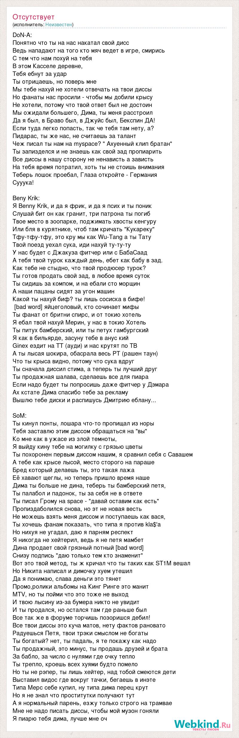 DoN-A: Понятно что ты на нас накатал свой дисc Ведь нападают на того кто мяч ведет в игре, смирись С тем что нам похуй на тебя В этом Касселе деревне, Тебя ебнут за удар Ты отрицаешь, но поверь мне Мы тебе нахуй не хотели отвечать на твои диссы Но фанаты нас просили - чтобы мы добили крысу Не хотели, потому что твой ответ был не достоин Мы ожидали большего, Дима, ты меня расстроил Да я был, в Браво был, в Джуйс был, Бекспин ДА! Если туда легко попасть, так че тебя там нету, а? Пидарас, ты же нас, не считаешь за талант Чеж писал ты нам на myspace? " Ахуенный клип братан" Ты запизделся и не знаешь как свой зад пропиарить Все диссы в нашу сторону не ненависть а зависть На тебя время потратил, хоть ты не стоишь внимания Теберь лошок проебал, Глаза откройте - Германия Сууука! Beny Krik: Я Benny Krik, и да я фрик, и да я псих и ты поник Слушай бит он как гранит, три патрона ты погиб Твое место в зоопарке, поджимать хвосты кенгуру Или бля в курятнике, чтоб там кричать "Кукареку" Тфу-тфу-тфу, это кру мы как Wu-Tang а ты Тату Твой поезд уехал сука, иди нахуй ту-ту-ту У нас будет с Джакуза фитчер или с БабаСаад А тебя твой турок каждый день, ебет как бабу в зад. Как тебе не стыдно, что твой продюсер турок? Ты готов продать свой зад, в любое время суток Ты сидишь за компом, и на ебали сто морщин А наши пацаны сидят за угон машин Какой ты нахуй биф? ты лишь сосиска в бифе! [bad word] яйцеголовый, кто сочинает мифы Ты фанат от бритни спирс, и от токио хотель Я ебал твой нахуй Мерин, у нас в токио Хотель Ты питух бамберский, или ты петух гамбургский Я как в бильярде, засуну тебе в анус кий Ginex ездит на ТТ (ауди) и нас крутят по ТВ А ты лысая шокира, обасрала весь РТ (рашен таун) Что ты крыса видно, потому что сука вдруг Ты сначала диссил стима, а теперь ты лучший друг Ты продажная шалава, сделаешь все для пиара Если надо будет ты попросишь даже фитчер у Дэмара Ах кстате Дима спасибо тебе за рекламу Вышлю тебе диски и распишусь Дмитрию еблану... SoM: Ты кинул понты, лошара что-то пропищал из норы Тебя заставлю этим диссом обращаться на "вы" Ко мне как в ужасе из злой темноты, Я выйду кину тебе на могилку с грязью цветы Ты похоронен первым диссом нашим, я сравнил себя с Савашем А тебе как крысе лысой, место сторого на параше Бред который делаешь ты, это такая лажа Её хавают щеглы, но теперь пришло время наше Дима ты больше не дина, теберь ты бамберский петя, Ты палабол и падонок, ты за себя не в ответе Ты писал Грому на space - "давай оставим как есть" Пропиздаболился снова, но эт не новая весть Не можешь взять меня диссом и поступаешь как вася, Ты хочешь фанам показать, что типа я против kla$'a Но нихуя не угадал, даю я парням респект Я никогда не хейтерил, ведь я не петя мамбет Дина продает свой грязный потный [bad word] Снизу подпись "даю только тем кто знаменит" Вот это твой метод, ты ж кричал что ты таких как ST1M вешал Но Никита написал и димочку хуем утешил Да я понимаю, слава деньги это тянет Промо,ролики альбомы на Кинг Ринге это манит MTV, но ты пойми что это тоже не выход И твою лысину из-за бумера никто не увидит И ты продался, но остался там где раньше был Все так же в форуме торчишь позоришся дебил! Все твои диссы это куча матов, нету фактов рановато Радуешься Петя, твои трэки смыслом не богаты Ты богатый? нет, ты падаль, я те покажу как надо Ты продажный, это минус, ты продашь друзей и брата За бабло, за число с нулями где очку тепло Ты трепло, кр
