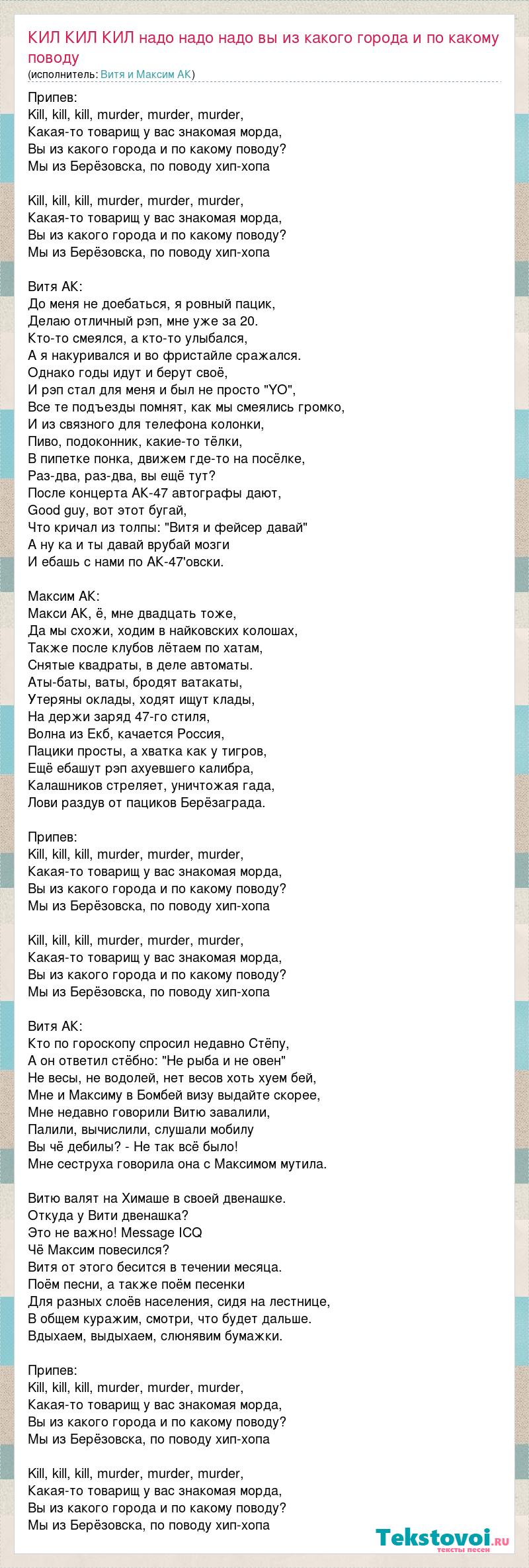 Припев: Kill, kill, kill, murder, murder, murder, Какая-то товарищ у вас знакомая морда, Вы из какого города и по какому поводу? Мы из Берёзовска, по поводу хип-хопа Kill, kill, kill, murder, murder, murder, Какая-то товарищ у вас знакомая морда, Вы из какого города и по какому поводу? Мы из Берёзовска, по поводу хип-хопа Витя АК: До меня не доебаться, я ровный пацик, Делаю отличный рэп, мне уже за 20. Кто-то смеялся, а кто-то улыбался, А я накуривался и во фристайле сражался. Однако годы идут и берут своё, И рэп стал для меня и был не просто "YO", Все те подъезды помнят, как мы смеялись громко, И из связного для телефона колонки, Пиво, подоконник, какие-то тёлки, В пипетке понка, движем где-то на посёлке, Раз-два, раз-два, вы ещё тут? После концерта АК-47 автографы дают, Good guy, вот этот бугай, Что кричал из толпы: "Витя и фейсер давай" А ну ка и ты давай врубай мозги И ебашь с нами по АК-47'овски. Максим АК: Макси АК, ё, мне двадцать тоже, Да мы схожи, ходим в найковских колошах, Также после клубов лётаем по хатам, Снятые квадраты, в деле автоматы. Аты-баты, ваты, бродят ватакаты, Утеряны оклады, ходят ищут клады, На держи заряд 47-го стиля, Волна из Екб, качается Россия, Пацики просты, а хватка как у тигров, Ещё ебашут рэп ахуевшего калибра, Калашников стреляет, уничтожая гада, Лови раздув от пациков Берёзаграда. Припев: Kill, kill, kill, murder, murder, murder, Какая-то товарищ у вас знакомая морда, Вы из какого города и по какому поводу? Мы из Берёзовска, по поводу хип-хопа Kill, kill, kill, murder, murder, murder, Какая-то товарищ у вас знакомая морда, Вы из какого города и по какому поводу? Мы из Берёзовска, по поводу хип-хопа Витя АК: Кто по гороскопу спросил недавно Стёпу, А он ответил стёбно: "Не рыба и не овен" Не весы, не водолей, нет весов хоть хуем бей, Мне и Максиму в Бомбей визу выдайте скорее, Мне недавно говорили Витю завалили, Палили, вычислили, слушали мобилу Вы чё дебилы? - Не так всё было! Мне сеструха говорила она с Максимом мутила. Витю валят на Химаше в своей двенашке. Откуда у Вити двенашка? Это не важно! Message ICQ Чё Максим повесился? Витя от этого бесится в течении месяца. Поём песни, а также поём песенки Для разных слоёв населения, сидя на лестнице, В общем куражим, смотри, что будет дальше. Вдыхаем, выдыхаем, слюнявим бумажки. Припев: Kill, kill, kill, murder, murder, murder, Какая-то товарищ у вас знакомая морда, Вы из какого города и по какому поводу? Мы из Берёзовска, по поводу хип-хопа Kill, kill, kill, murder, murder, murder, Какая-то товарищ у вас знакомая морда, Вы из какого города и по какому поводу? Мы из Берёзовска, по поводу хип-хопа