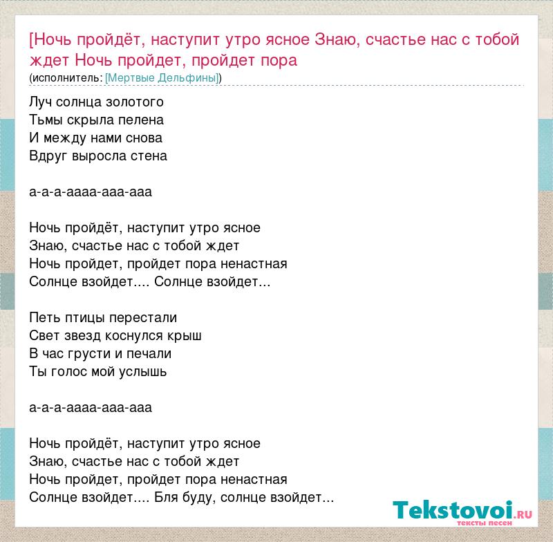 Главная→Исполнители→[Мертвые Дельфины]→[Ночь пройдёт, наступит утро ясное Знаю, счастье нас с тобой ждет Ночь п