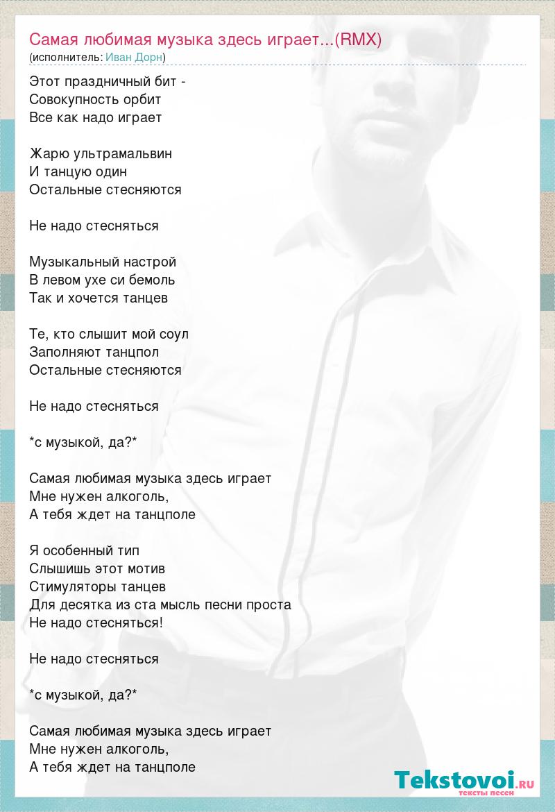 Этот праздничный бит - Совокупность орбит Все как надо играет Жарю ультрамальвин И танцую один Остальные стесняются Не надо стесняться Музыкальный настрой В левом ухе си бемоль Так и хочется танцев Те, кто слышит мой соул Заполняют танцпол Остальные стесняются Не надо стесняться *с музыкой, да?* Самая любимая музыка здесь играет Мне нужен алкоголь, А тебя ждет на танцполе Я особенный тип Слышишь этот мотив Стимуляторы танцев Для десятка из ста мысль песни проста Не надо стесняться! Не надо стесняться *с музыкой, да?* Самая любимая музыка здесь играет Мне нужен алкоголь, А тебя ждет на танцполе