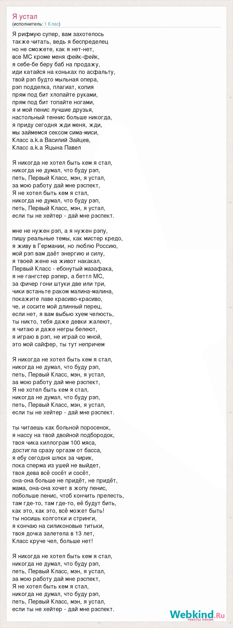 Я рифмую супер, вам захотелось также читать, ведь я беспределец но не сможете, как я нет-нет, все МС кроме меня фейк-фейк, я себе-бе беру баб на продажу, иди катайся на коньках по асфальту, твой рэп будто мыльная опера, рэп подделка, плагиат, копия прям под бит хлопайте руками, прям под бит топайте ногами, я и мой пенис лучшие друзья, настольный теннис больше никогда, я приду сегодня жди меня, жди, мы займемся сексом cима-миси, Класс a.k.a Василий Зайцев, Класс a.k.a Яцына Павел Я никогда не хотел быть кем я стал, никогда не думал, что буду рэп, петь, Первый Класс, мэн, я устал, за мою работу дай мне рэспект, Я не хотел быть кем я стал, никогда не думал, что буду рэп, петь, Первый Класс, мэн, я устал, если ты не хейтер - дай мне рэспект. мне не нужен рэп, а я нужен рэпу, пишу реальные темы, как мистер кредо, я живу в Германии, но люблю Россию, мой рэп вам даёт энергию и силу, я твоей жене на живот накакал, Первый Класс - ебонутый мазафака, я не гангстер рэпер, а беттл МС, за фичер гони штуки две или три, чики встаньте раком малина-малина, покажите лаве красиво-красиво, че, и сосите мой длинный перец, если нет, я вам выбью хуем челюсть, ты никто, тебя даже девки жалеют, я читаю и даже негры белеют, я играю в рэп, не играй со мной, это мой сайфер, ты тут непричем Я никогда не хотел быть кем я стал, никогда не думал, что буду рэп, петь, Первый Класс, мэн, я устал, за мою работу дай мне рэспект, Я не хотел быть кем я стал, никогда не думал, что буду рэп, петь, Первый Класс, мэн, я устал, если ты не хейтер - дай мне рэспект. ты читаешь как больной поросенок, я нассу на твой двойной подбородок, твоя чика киллограм 100 мяса, достигла сразу оргазм от басса, я ебу сегодня шлюх за чирик, пока сперма из ушей не выйдет, твоя дева всё сосёт и сосёт, она-она больше не придёт, не придёт, мама, она-она хочет в жопу пенис, побольше пенис, чтоб кончить прелесть, там где-то, там где-то, её будут бить, как это, как это, всё может быть! ты носишь колготки и стринги, я кончаю на силиконовые титьки, твоя дочка залетела в 13 лет, Класс круче чел, больше нет! Я никогда не хотел быть кем я стал, никогда не думал, что буду рэп, петь, Первый Класс, мэн, я устал, за мою работу дай мне рэспект, Я не хотел быть кем я стал, никогда не думал, что буду рэп, петь, Первый Класс, мэн, я устал, если ты не хейтер - дай мне рэспект.