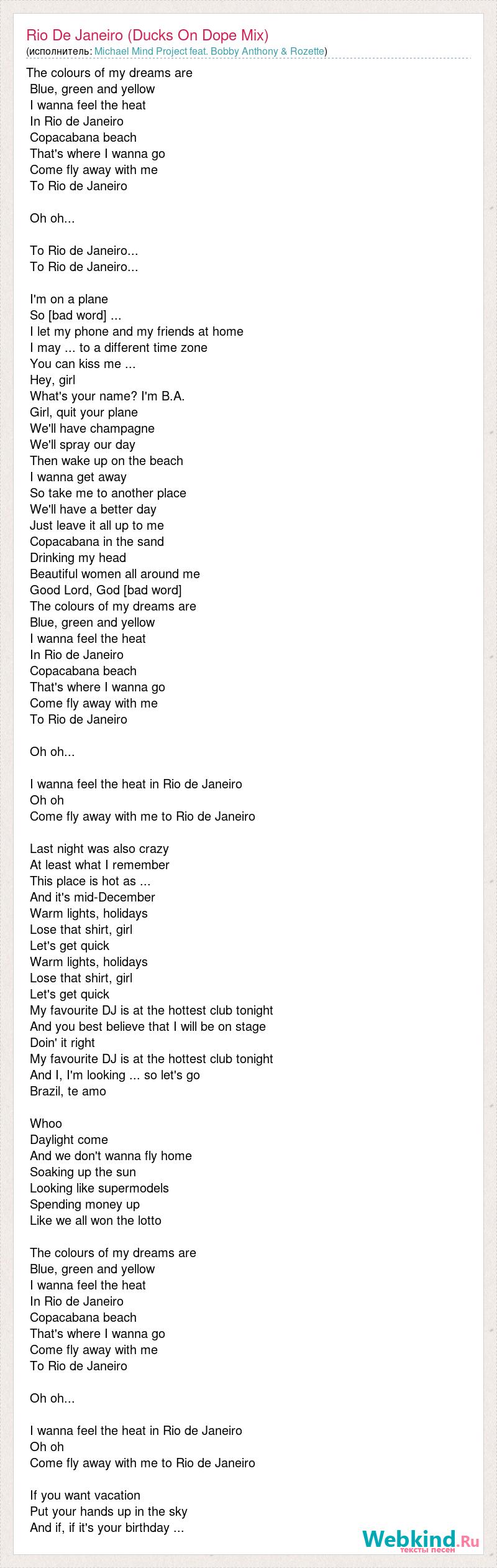 The colours of my dreams are Blue, green and yellow I wanna feel the heat In Rio de Janeiro Copacabana beach That's where I wanna go Come fly away with me To Rio de Janeiro Oh oh... To Rio de Janeiro... To Rio de Janeiro... I'm on a plane So [bad word] ... I let my phone and my friends at home I may ... to a different time zone You can kiss me ... Hey, girl What's your name? I'm B.A. Girl, quit your plane We'll have champagne We'll spray our day Then wake up on the beach I wanna get away So take me to another place We'll have a better day Just leave it all up to me Copacabana in the sand Drinking my head Beautiful women all around me Good Lord, God [bad word] The colours of my dreams are Blue, green and yellow I wanna feel the heat In Rio de Janeiro Copacabana beach That's where I wanna go Come fly away with me To Rio de Janeiro Oh oh... I wanna feel the heat in Rio de Janeiro Oh oh Come fly away with me to Rio de Janeiro Last night was also crazy At least what I remember This place is hot as ... And it's mid-December Warm lights, holidays Lose that shirt, girl Let's get quick Warm lights, holidays Lose that shirt, girl Let's get quick My favourite DJ is at the hottest club tonight And you best believe that I will be on stage Doin' it right My favourite DJ is at the hottest club tonight And I, I'm looking ... so let's go Brazil, te amo Whoo Daylight come And we don't wanna fly home Soaking up the sun Looking like supermodels Spending money up Like we all won the lotto The colours of my dreams are Blue, green and yellow I wanna feel the heat In Rio de Janeiro Copacabana beach That's where I wanna go Come fly away with me To Rio de Janeiro Oh oh... I wanna feel the heat in Rio de Janeiro Oh oh Come fly away with me to Rio de Janeiro If you want vacation Put your hands up in the sky And if, if it's your birthday ...
