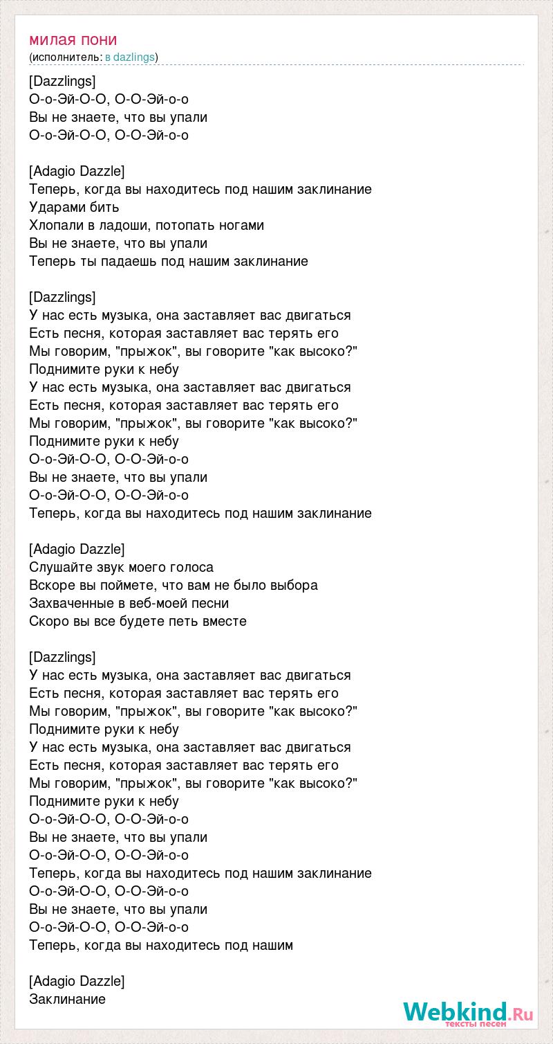 [Dazzlings] О-о-Эй-О-О, О-О-Эй-о-о Вы не знаете, что вы упали О-о-Эй-О-О, О-О-Эй-о-о [Adagio Dazzle] Теперь, когда вы находитесь под нашим заклинание Ударами бить Хлопали в ладоши, потопать ногами Вы не знаете, что вы упали Теперь ты падаешь под нашим заклинание [Dazzlings] У нас есть музыка, она заставляет вас двигаться Есть песня, которая заставляет вас терять его Мы говорим, "прыжок", вы говорите "как высоко?" Поднимите руки к небу У нас есть музыка, она заставляет вас двигаться Есть песня, которая заставляет вас терять его Мы говорим, "прыжок", вы говорите "как высоко?" Поднимите руки к небу О-о-Эй-О-О, О-О-Эй-о-о Вы не знаете, что вы упали О-о-Эй-О-О, О-О-Эй-о-о Теперь, когда вы находитесь под нашим заклинание [Adagio Dazzle] Слушайте звук моего голоса Вскоре вы поймете, что вам не было выбора Захваченные в веб-моей песни Скоро вы все будете петь вместе [Dazzlings] У нас есть музыка, она заставляет вас двигаться Есть песня, которая заставляет вас терять его Мы говорим, "прыжок", вы говорите "как высоко?" Поднимите руки к небу У нас есть музыка, она заставляет вас двигаться Есть песня, которая заставляет вас терять его Мы говорим, "прыжок", вы говорите "как высоко?" Поднимите руки к небу О-о-Эй-О-О, О-О-Эй-о-о Вы не знаете, что вы упали О-о-Эй-О-О, О-О-Эй-о-о Теперь, когда вы находитесь под нашим заклинание О-о-Эй-О-О, О-О-Эй-о-о Вы не знаете, что вы упали О-о-Эй-О-О, О-О-Эй-о-о Теперь, когда вы находитесь под нашим [Adagio Dazzle] Заклинание