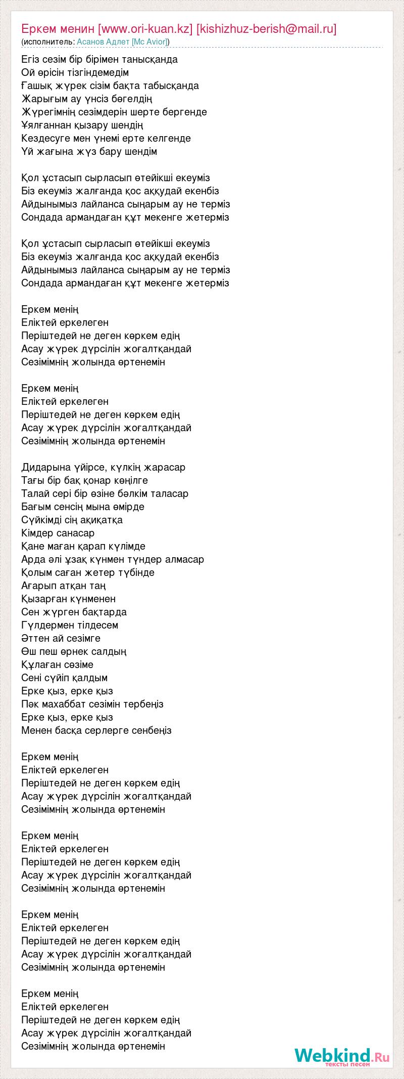 Егіз сезім бір бірімен танысқанда Ой өрісін тізгіндемедім Ғашық жүрек сізім бақта табысқанда Жарығым ау үнсіз бөгелдің Жүрегімнің сезімдерін шерте бергенде Ұялғаннан қызару шендің Кездесуге мен үнемі ерте келгенде Үй жағына жүз бару шендім Қол ұстасып сырласып өтейікші екеуміз Біз екеуміз жалғанда қос аққудай екенбіз Айдынымыз лайланса сыңарым ау не терміз Сондада армандаған құт мекенге жетерміз Қол ұстасып сырласып өтейікші екеуміз Біз екеуміз жалғанда қос аққудай екенбіз Айдынымыз лайланса сыңарым ау не терміз Сондада армандаған құт мекенге жетерміз Еркем менің Еліктей еркелеген Періштедей не деген көркем едің Асау жүрек дүрсілін жоғалтқандай Сезімімнің жолында өртенемін Еркем менің Еліктей еркелеген Періштедей не деген көркем едің Асау жүрек дүрсілін жоғалтқандай Сезімімнің жолында өртенемін Дидарына үйірсе, күлкің жарасар Тағы бір бақ қонар көңілге Талай сері бір өзіне бәлкім таласар Бағым сенсің мына өмірде Сүйкімді сің ақиқатқа Кімдер санасар Қане маған қарап күлімде Арда әлі ұзақ күнмен түндер алмасар Қолым саған жетер түбінде Ағарып атқан таң Қызарған күнменен Сен жүрген бақтарда Гүлдермен тілдесем Әттен ай сезімге Өш пеш өрнек салдың Құлаған сөзіме Сені сүйіп қалдым Ерке қыз, ерке қыз Пәк махаббат сезімін тербеңіз Ерке қыз, ерке қыз Менен басқа серлерге сенбеңіз Еркем менің Еліктей еркелеген Періштедей не деген көркем едің Асау жүрек дүрсілін жоғалтқандай Сезімімнің жолында өртенемін Еркем менің Еліктей еркелеген Періштедей не деген көркем едің Асау жүрек дүрсілін жоғалтқандай Сезімімнің жолында өртенемін Еркем менің Еліктей еркелеген Періштедей не деген көркем едің Асау жүрек дүрсілін жоғалтқандай Сезімімнің жолында өртенемін Еркем менің Еліктей еркелеген Періштедей не деген көркем едің Асау жүрек дүрсілін жоғалтқандай Сезімімнің жолында өртенемін
