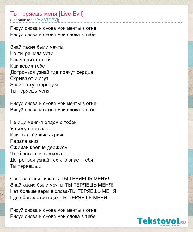 Рисуй снова и снова мои мечты в огне Рисуй снова и снова мои слова в тебе Знай такие были мечты Но ты решила уйти Как я прятал тебя Как верил тебе Дотронься узнай где прячут сердца Скрывают и лгут Знай по ту сторону я Ты теряешь меня Рисуй снова и снова мои мечты в огне Рисуй снова и снова мои слова в тебе Не ищи меня-я рядом с тобой Я вижу насквозь Как ты отбиваясь крича Падала вниз Сжимай крепче держись Чтоб остаться в живых Дотронься узнай тех кто знает тебя Ты теряешь... Свет заставит искать-ТЫ ТЕРЯЕШЬ МЕНЯ! Знай какие были мечты-ТЫ ТЕРЯЕШЬ МЕНЯ! Нет больше веры в слова-ТЫ ТЕРЯЕШЬ МЕНЯ! Где обрывается вдох-ТЫ ТЕРЯЕШЬ МЕНЯ! Рисуй снова и снова мои мечты в огне Рисуй снова и снова мои слова в тебе