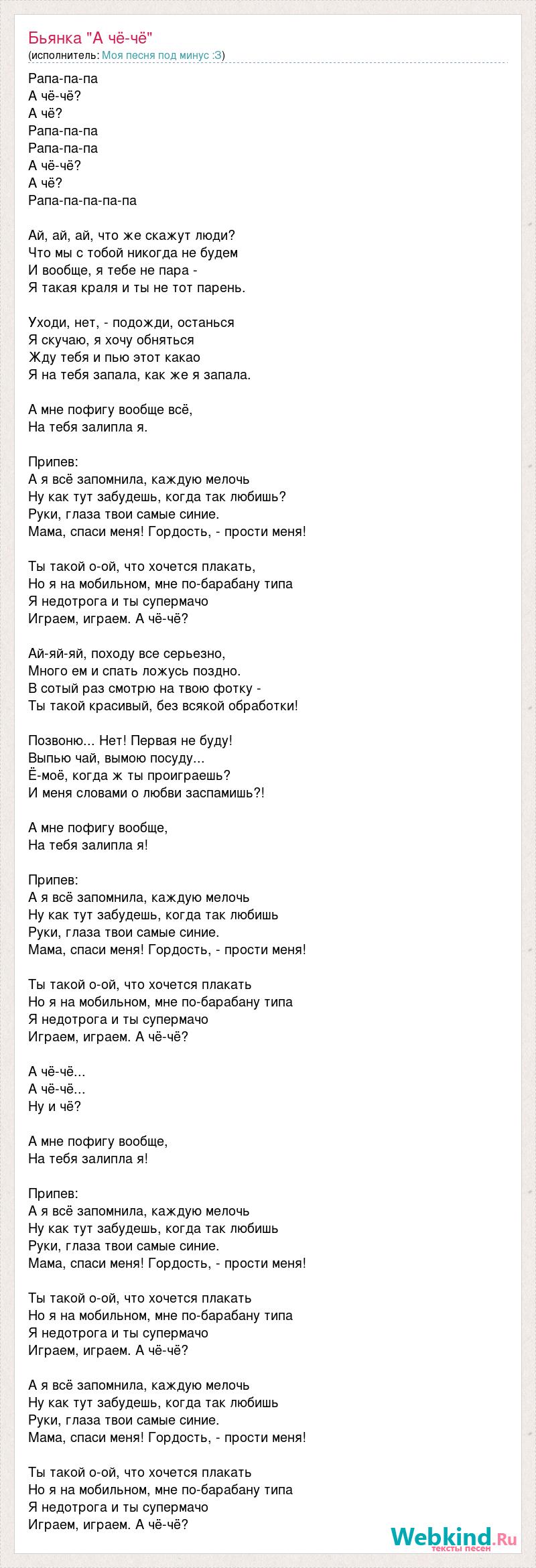 Рапа-па-па А чё-чё? А чё? Рапа-па-па Рапа-па-па А чё-чё? А чё? Рапа-па-па-па-па Ай, ай, ай, что же скажут люди? Что мы с тобой никогда не будем И вообще, я тебе не пара - Я такая краля и ты не тот парень. Уходи, нет, - подожди, останься Я скучаю, я хочу обняться Жду тебя и пью этот какао Я на тебя запала, как же я запала. А мне пофигу вообще всё, На тебя залипла я. Припев: А я всё запомнила, каждую мелочь Ну как тут забудешь, когда так любишь? Руки, глаза твои самые синие. Мама, спаси меня! Гордость, - прости меня! Ты такой о-ой, что хочется плакать, Но я на мобильном, мне по-барабану типа Я недотрога и ты супермачо Играем, играем. А чё-чё? Ай-яй-яй, походу все серьезно, Много ем и спать ложусь поздно. В сотый раз смотрю на твою фотку - Ты такой красивый, без всякой обработки! Позвоню... Нет! Первая не буду! Выпью чай, вымою посуду... Ё-моё, когда ж ты проиграешь? И меня словами о любви заспамишь?! А мне пофигу вообще, На тебя залипла я! Припев: А я всё запомнила, каждую мелочь Ну как тут забудешь, когда так любишь Руки, глаза твои самые синие. Мама, спаси меня! Гордость, - прости меня! Ты такой о-ой, что хочется плакать Но я на мобильном, мне по-барабану типа Я недотрога и ты супермачо Играем, играем. А чё-чё? А чё-чё... А чё-чё... Ну и чё? А мне пофигу вообще, На тебя залипла я! Припев: А я всё запомнила, каждую мелочь Ну как тут забудешь, когда так любишь Руки, глаза твои самые синие. Мама, спаси меня! Гордость, - прости меня! Ты такой о-ой, что хочется плакать Но я на мобильном, мне по-барабану типа Я недотрога и ты супермачо Играем, играем. А чё-чё? А я всё запомнила, каждую мелочь Ну как тут забудешь, когда так любишь Руки, глаза твои самые синие. Мама, спаси меня! Гордость, - прости меня! Ты такой о-ой, что хочется плакать Но я на мобильном, мне по-барабану типа Я недотрога и ты супермачо Играем, играем. А чё-чё?