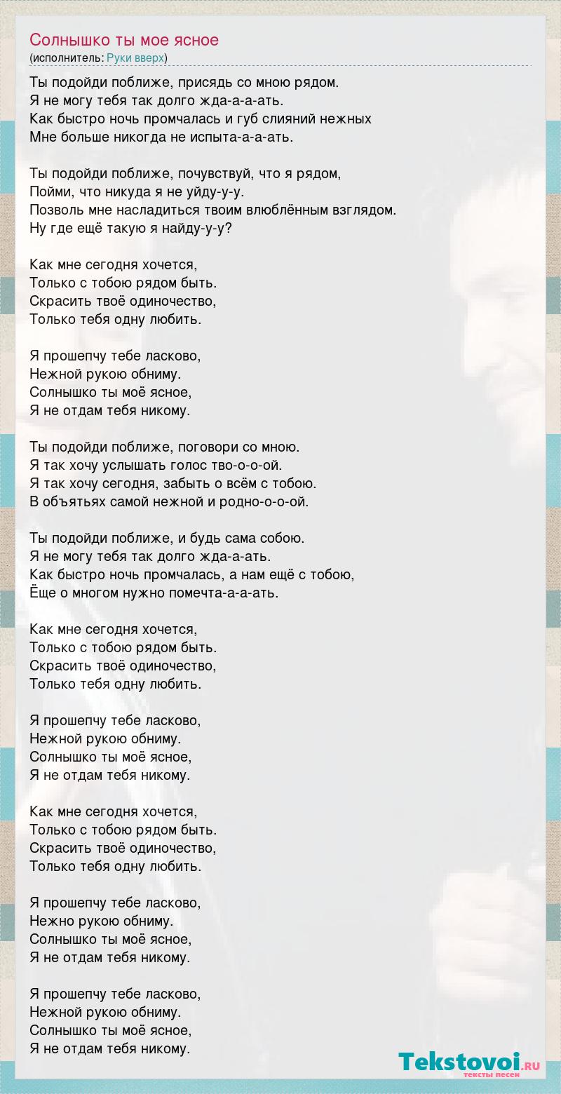 Ты подойди поближе, присядь со мною рядом. Я не могу тебя так долго жда-а-а-ать. Как быстро ночь промчалась и губ слияний нежных Мне больше никогда не испыта-а-а-ать. Ты подойди поближе, почувствуй, что я рядом, Пойми, что никуда я не уйду-у-у. Позволь мне насладиться твоим влюблённым взглядом. Ну где ещё такую я найду-у-у? Как мне сегодня хочется, Только с тобою рядом быть. Скрасить твоё одиночество, Только тебя одну любить. Я прошепчу тебе ласково, Нежной рукою обниму. Солнышко ты моё ясное, Я не отдам тебя никому. Ты подойди поближе, поговори со мною. Я так хочу услышать голос тво-о-о-ой. Я так хочу сегодня, забыть о всём с тобою. В объятьях самой нежной и родно-о-о-ой. Ты подойди поближе, и будь сама собою. Я не могу тебя так долго жда-а-ать. Как быстро ночь промчалась, а нам ещё с тобою, Ёще о многом нужно помечта-а-а-ать. Как мне сегодня хочется, Только с тобою рядом быть. Скрасить твоё одиночество, Только тебя одну любить. Я прошепчу тебе ласково, Нежной рукою обниму. Солнышко ты моё ясное, Я не отдам тебя никому. Как мне сегодня хочется, Только с тобою рядом быть. Скрасить твоё одиночество, Только тебя одну любить. Я прошепчу тебе ласково, Нежно рукою обниму. Солнышко ты моё ясное, Я не отдам тебя никому. Я прошепчу тебе ласково, Нежной рукою обниму. Солнышко ты моё ясное, Я не отдам тебя никому.