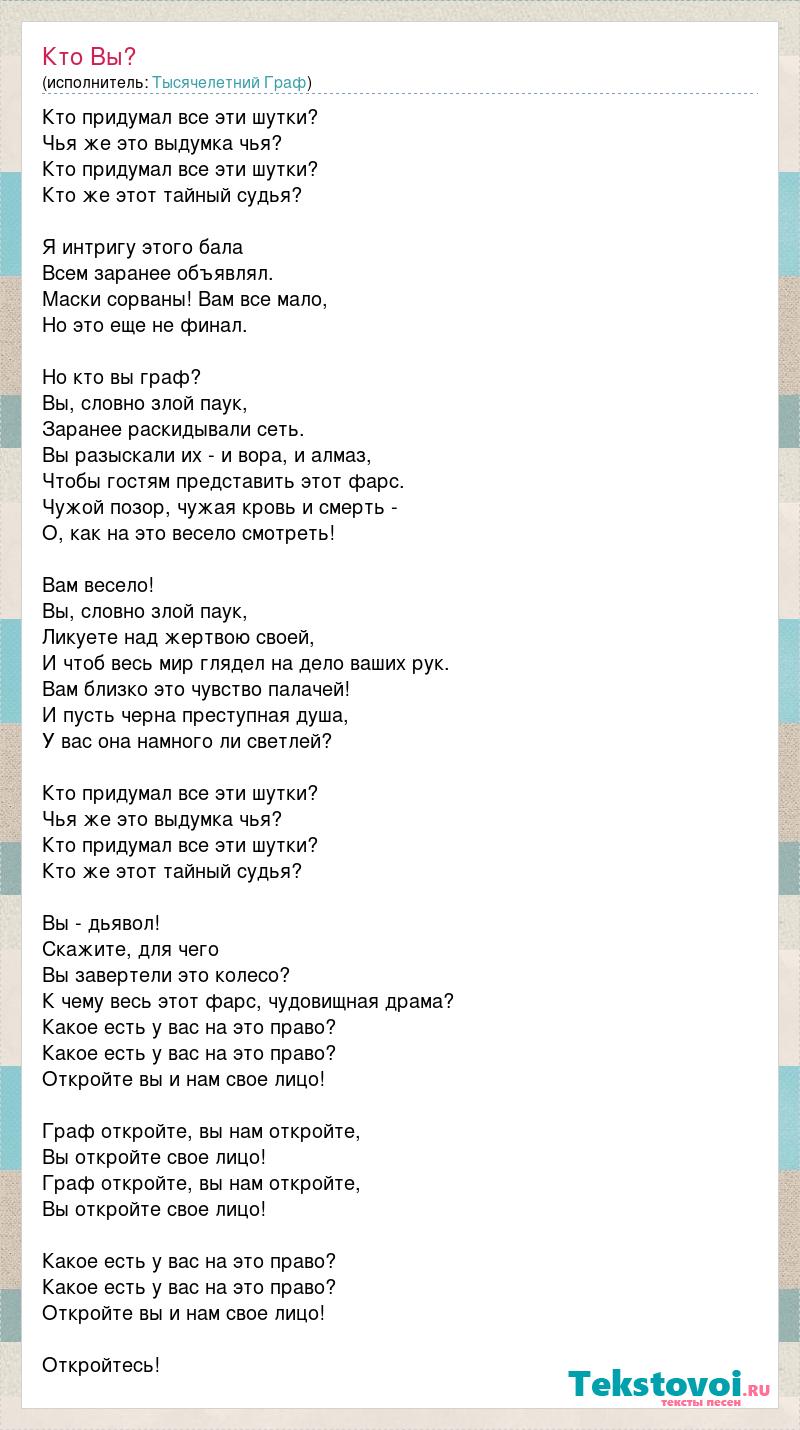 Кто придумал все эти шутки? Чья же это выдумка чья? Кто придумал все эти шутки? Кто же этот тайный судья? Я интригу этого бала Всем заранее объявлял. Маски сорваны! Вам все мало, Но это еще не финал. Но кто вы граф? Вы, словно злой паук, Заранее раскидывали сеть. Вы разыскали их - и вора, и алмаз, Чтобы гостям представить этот фарс. Чужой позор, чужая кровь и смерть - О, как на это весело смотреть! Вам весело! Вы, словно злой паук, Ликуете над жертвою своей, И чтоб весь мир глядел на дело ваших рук. Вам близко это чувство палачей! И пусть черна преступная душа, У вас она намного ли светлей? Кто придумал все эти шутки? Чья же это выдумка чья? Кто придумал все эти шутки? Кто же этот тайный судья? Вы - дьявол! Скажите, для чего Вы завертели это колесо? К чему весь этот фарс, чудовищная драма? Какое есть у вас на это право? Какое есть у вас на это право? Откройте вы и нам свое лицо! Граф откройте, вы нам откройте, Вы откройте свое лицо! Граф откройте, вы нам откройте, Вы откройте свое лицо! Какое есть у вас на это право? Какое есть у вас на это право? Откройте вы и нам свое лицо! Откройтесь!
