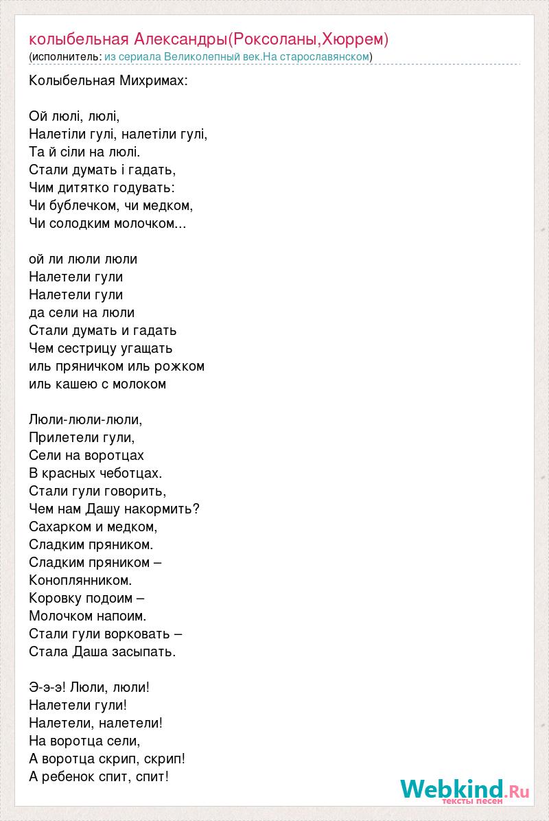 Колыбельная Михримах: Ой люлі, люлі, Налетіли гулі, налетіли гулі, Та й сіли на люлі. Стали думать і гадать, Чим дитятко годувать: Чи бублечком, чи медком, Чи солодким молочком... ой ли люли люли Налетели гули Налетели гули да сели на люли Стали думать и гадать Чем сестрицу угащать иль пряничком иль рожком иль кашею с молоком Люли-люли-люли, Прилетели гули, Сели на воротцах В красных чеботцах. Стали гули говорить, Чем нам Дашу накормить? Сахарком и медком, Сладким пряником. Сладким пряником – Коноплянником. Коровку подоим – Молочком напоим. Стали гули ворковать – Стала Даша засыпать. Э-э-э! Люли, люли! Налетели гули! Налетели, налетели! На воротца сели, А воротца скрип, скрип! А ребенок спит, спит!