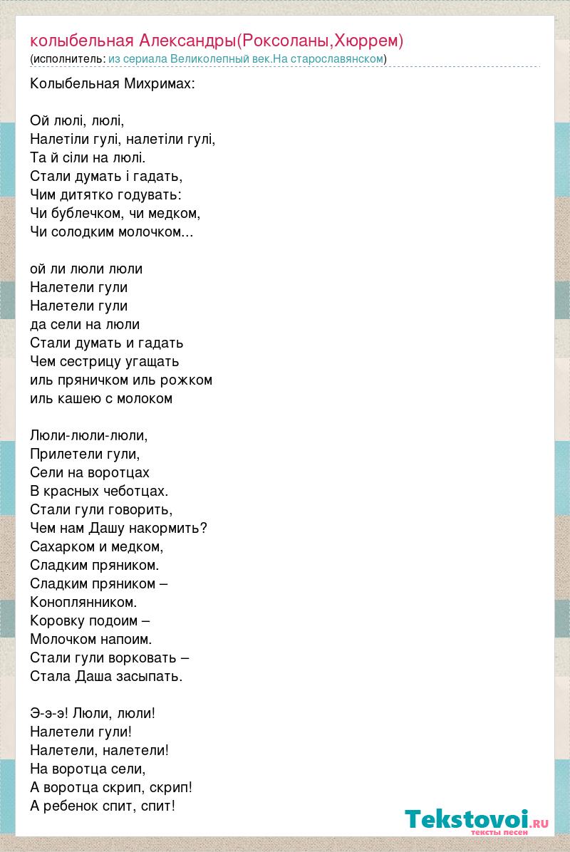 Колыбельная Михримах: Ой люлі, люлі, Налетіли гулі, налетіли гулі, Та й сіли на люлі. Стали думать і гадать, Чим дитятко годувать: Чи бублечком, чи медком, Чи солодким молочком... ой ли люли люли Налетели гули Налетели гули да сели на люли Стали думать и гадать Чем сестрицу угащать иль пряничком иль рожком иль кашею с молоком Люли-люли-люли, Прилетели гули, Сели на воротцах В красных чеботцах. Стали гули говорить, Чем нам Дашу накормить? Сахарком и медком, Сладким пряником. Сладким пряником – Коноплянником. Коровку подоим – Молочком напоим. Стали гули ворковать – Стала Даша засыпать. Э-э-э! Люли, люли! Налетели гули! Налетели, налетели! На воротца сели, А воротца скрип, скрип! А ребенок спит, спит!