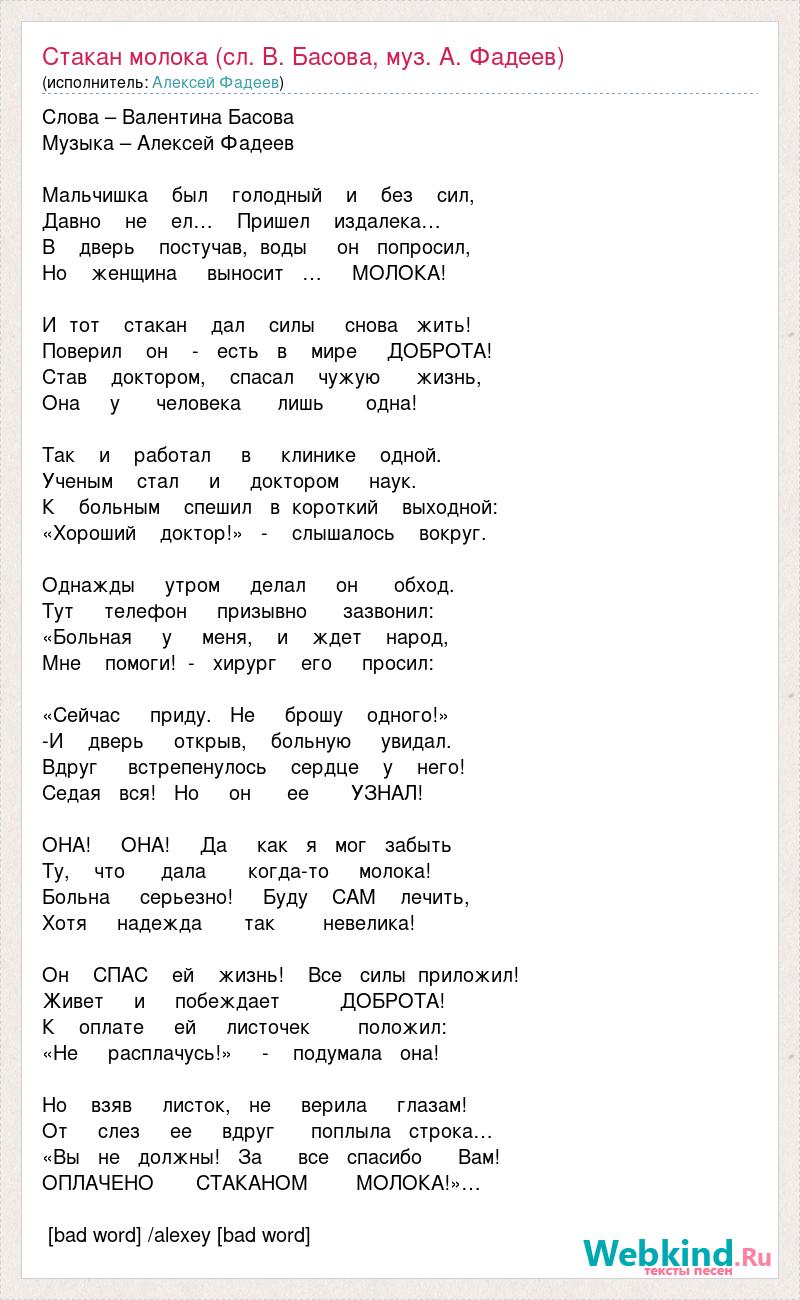 Слова – Валентина Басова Музыка – Алексей Фадеев Мальчишка был голодный и без сил, Давно не ел… Пришел издалека… В дверь постучав, воды он попросил, Но женщина выносит … МОЛОКА! И тот стакан дал силы снова жить! Поверил он - есть в мире ДОБРОТА! Став доктором, спасал чужую жизнь, Она у человека лишь одна! Так и работал в клинике одной. Ученым стал и доктором наук. К больным спешил в короткий выходной: «Хороший доктор!» - слышалось вокруг. Однажды утром делал он обход. Тут телефон призывно зазвонил: «Больная у меня, и ждет народ, Мне помоги! - хирург его просил: «Сейчас приду. Не брошу одного!» -И дверь открыв, больную увидал. Вдруг встрепенулось сердце у него! Седая вся! Но он ее УЗНАЛ! ОНА! ОНА! Да как я мог забыть Ту, что дала когда-то молока! Больна серьезно! Буду САМ лечить, Хотя надежда так невелика! Он СПАС ей жизнь! Все силы приложил! Живет и побеждает ДОБРОТА! К оплате ей листочек положил: «Не расплачусь!» - подумала она! Но взяв листок, не верила глазам! От слез ее вдруг поплыла строка… «Вы не должны! За все спасибо Вам! ОПЛАЧЕНО СТАКАНОМ МОЛОКА!»… [bad word] /alexey [bad word]