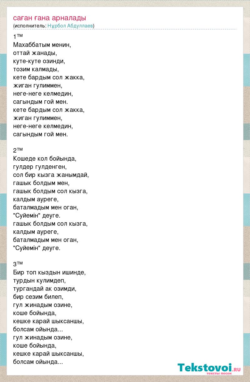 1™ Махаббатым менин, оттай жанады, куте-куте озинди, тозим калмады, кете бардым сол жакка, жиган гулиммен, неге-неге келмедин, сагындым гой мен. кете бардым сол жакка, жиган гулиммен, неге-неге келмедин, сагындым гой мен. 2™ Кошеде кол бойында, гулдер гулденген, сол бир кызга жанымдай, гашык болдым мен, гашык болдым сол кызга, калдым ауреге, баталмадым мен оган, "Суйемiн" деуге. гашык болдым сол кызга, калдым ауреге, баталмадым мен оган, "Суйемiн" деуге. 3™ Бир топ кыздын ишинде, турдын кулимдеп, тургандай ак озимди, бир сезим билеп, гул жинадым озине, коше бойында, кешке карай шыксаншы, болсам ойында... гул жинадым озине, коше бойында, кешке карай шыксаншы, болсам ойында...