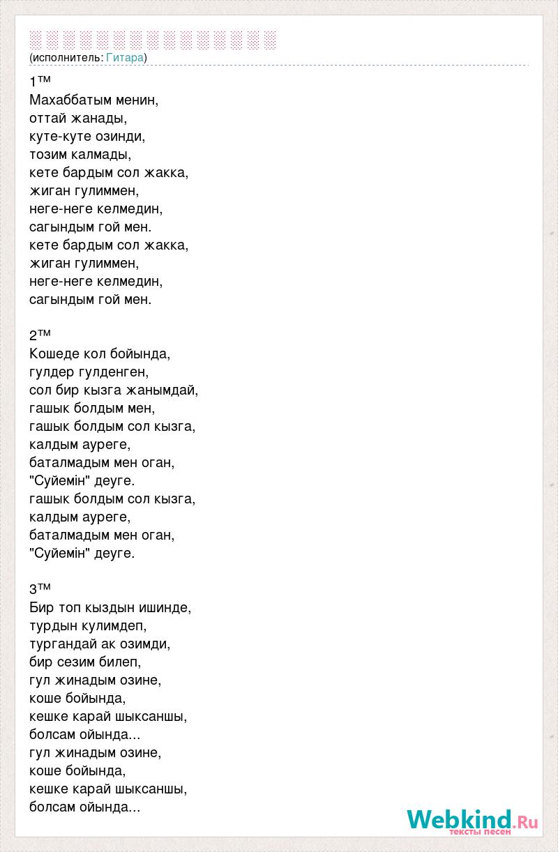 1™ Махаббатым менин, оттай жанады, куте-куте озинди, тозим калмады, кете бардым сол жакка, жиган гулиммен, неге-неге келмедин, сагындым гой мен. кете бардым сол жакка, жиган гулиммен, неге-неге келмедин, сагындым гой мен. 2™ Кошеде кол бойында, гулдер гулденген, сол бир кызга жанымдай, гашык болдым мен, гашык болдым сол кызга, калдым ауреге, баталмадым мен оган, "Суйемiн" деуге. гашык болдым сол кызга, калдым ауреге, баталмадым мен оган, "Суйемiн" деуге. 3™ Бир топ кыздын ишинде, турдын кулимдеп, тургандай ак озимди, бир сезим билеп, гул жинадым озине, коше бойында, кешке карай шыксаншы, болсам ойында... гул жинадым озине, коше бойында, кешке карай шыксаншы, болсам ойында...