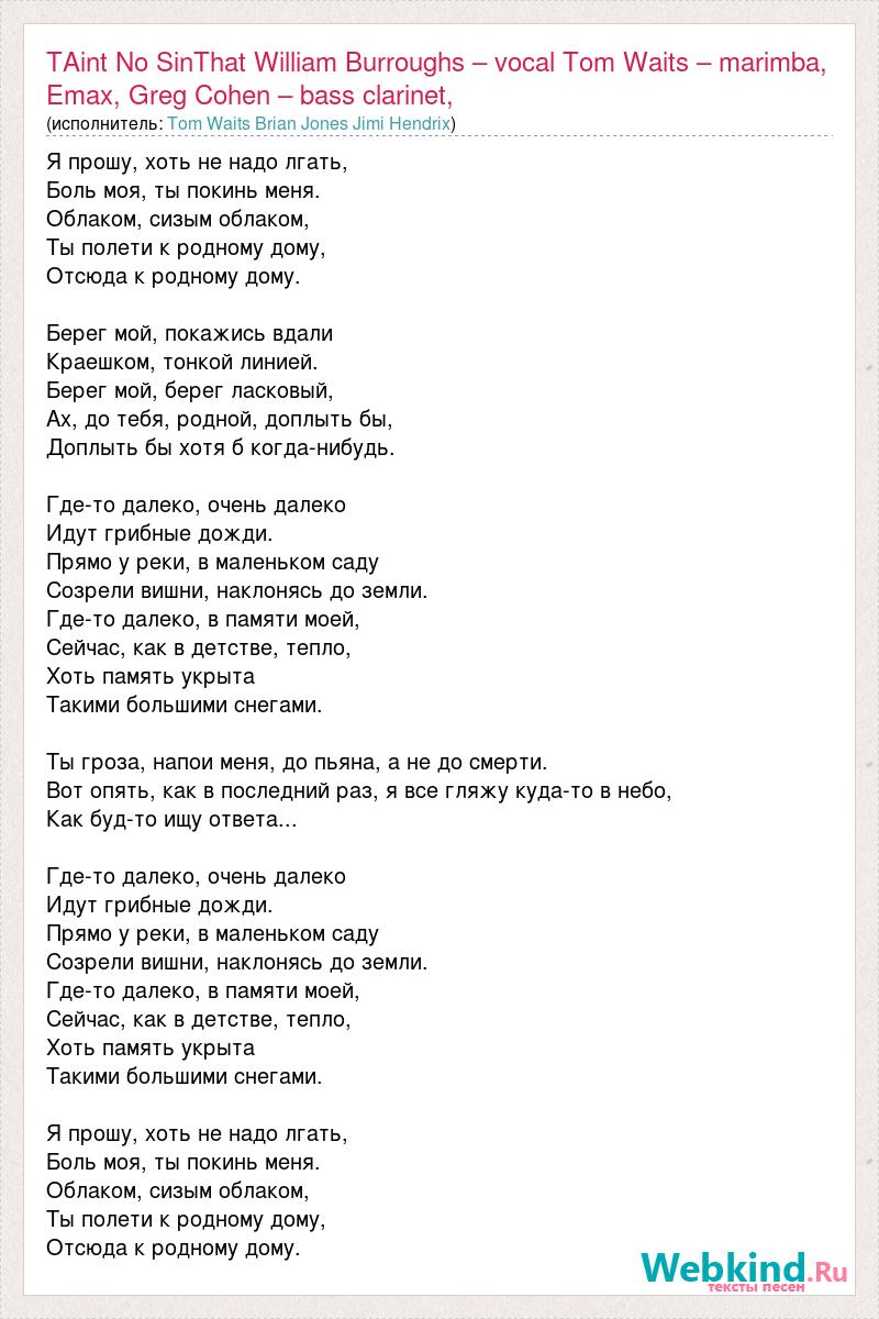 Я прошу, хоть не надо лгать, Боль моя, ты покинь меня. Облаком, сизым облаком, Ты полети к родному дому, Отсюда к родному дому. Берег мой, покажись вдали Краешком, тонкой линией. Берег мой, берег ласковый, Ах, до тебя, родной, доплыть бы, Доплыть бы хотя б когда-нибудь. Где-то далеко, очень далеко Идут грибные дожди. Прямо у реки, в маленьком саду Созрели вишни, наклонясь до земли. Где-то далеко, в памяти моей, Сейчас, как в детстве, тепло, Хоть память укрыта Такими большими снегами. Ты гроза, напои меня, до пьяна, а не до смерти. Вот опять, как в последний раз, я все гляжу куда-то в небо, Как буд-то ищу ответа... Где-то далеко, очень далеко Идут грибные дожди. Прямо у реки, в маленьком саду Созрели вишни, наклонясь до земли. Где-то далеко, в памяти моей, Сейчас, как в детстве, тепло, Хоть память укрыта Такими большими снегами. Я прошу, хоть не надо лгать, Боль моя, ты покинь меня. Облаком, сизым облаком, Ты полети к родному дому, Отсюда к родному дому.