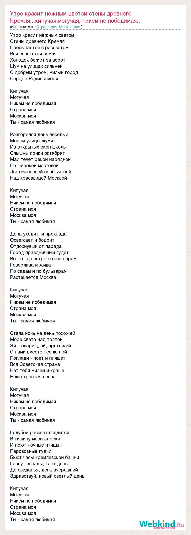 Утро красит нежным светом Стены древнего Кремля Просыпается с рассветом Вся советская земля Холодок бежит за ворот Шум на улицах сильней С добрым утром, милый город Сердце Родины моей Кипучая Могучая Никем не победимая Страна моя Москва моя Ты - самая любимая Разгорелся день веселый Морем улицы шумят Из открытых окон школы Слышны крики октябрят Май течет рекой нарядной По широкой мостовой Льется песней необъятной Над красавицей Москвой Кипучая Могучая Никем не победимая Страна моя Москва моя Ты - самая любимая День уходит, и прохлада Освежает и бодрит Отдохнувши от парада Город праздничный гудит Вот когда встречаться парам Говорлива и жива По садам и по бульварам Растекается Москва Кипучая Могучая Никем не победимая Страна моя Москва моя Ты - самая любимая Стала ночь на день похожей Море света над толпой Эй, товарищ, эй, прохожий С нами вместе песню пой Погляди - поет и пляшет Вся Советская страна Нет тебя милей и краше Наша красная весна Кипучая Могучая Никем не победимая Страна моя Москва моя Ты - самая любимая Голубой рассвет глядится В тишину москвы-реки И поют ночные птицы - Паровозные гудки Бьют часы кремлевской башни Гаснут звезды, тает день До свиданья, день вчерашний Здравствуй, новый светлый день Кипучая Могучая Никем не победимая Страна моя Москва моя Ты - самая любимая