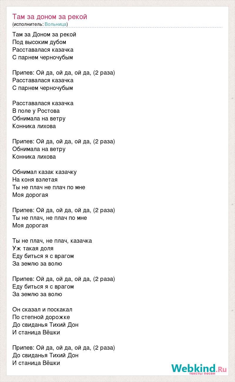 Там за Доном за рекой Под высоким дубом Расставалася казачка С парнем черночубым Припев: Ой да, ой да, ой да, (2 раза) Расставалася казачка С парнем черночубым Расставалася казачка В поле у Ростова Обнимала на ветру Конника лихова Припев: Ой да, ой да, ой да, (2 раза) Обнимала на ветру Конника лихова Обнимал казак казачку На коня взлетая Ты не плач не плач по мне Моя дорогая Припев: Ой да, ой да, ой да, (2 раза) Ты не плач, не плач по мне Моя дорогая Ты не плач, не плач, казачка Уж такая доля Еду биться я с врагом За землю за волю Припев: Ой да, ой да, ой да, (2 раза) Еду биться я с врагом За землю за волю Он сказал и поскакал По степной дорожке До свиданья Тихий Дон И станица Вёшки Припев: Ой да, ой да, ой да, (2 раза) До свиданья Тихий Дон И станица Вёшки