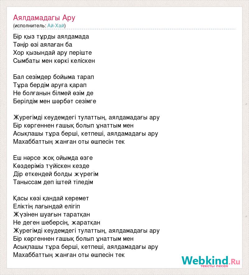 Бір қыз тұрды аялдамада Тәңір өзі аялаған ба Хор қызындай ару періште Сымбаты мен көркі келіскен Бал сезімдер бойыма тарап Тұра бердім аруға қарап Не болғанын білмей өзім де Берілдім мен шәрбәт сезімге Журегімді кеудемдегі тулаттың, аялдамадағы ару Бір көргеннен ғашық болып ұнаттым мен Асықпашы тұра берші, кетпеші, аялдамадағы ару Махаббаттың жанған оты өшпесін тек Еш нәрсе жоқ ойымда өзге Көздеріміз түйіскен кезде Дір еткендей болды жүрегім Таныссам деп іштей тіледім Қасы көзі қандай керемет Еліктің лағындай елігіп Жүзінен шуағын таратқан Не деген шеберсің, жаратқан Журегімді кеудемдегі тулаттың, аялдамадағы ару Бір көргеннен ғашық болып ұнаттым мен Асықпашы тұра берші, кетпеші, аялдамадағы ару Махаббаттың жанған оты өшпесін тек