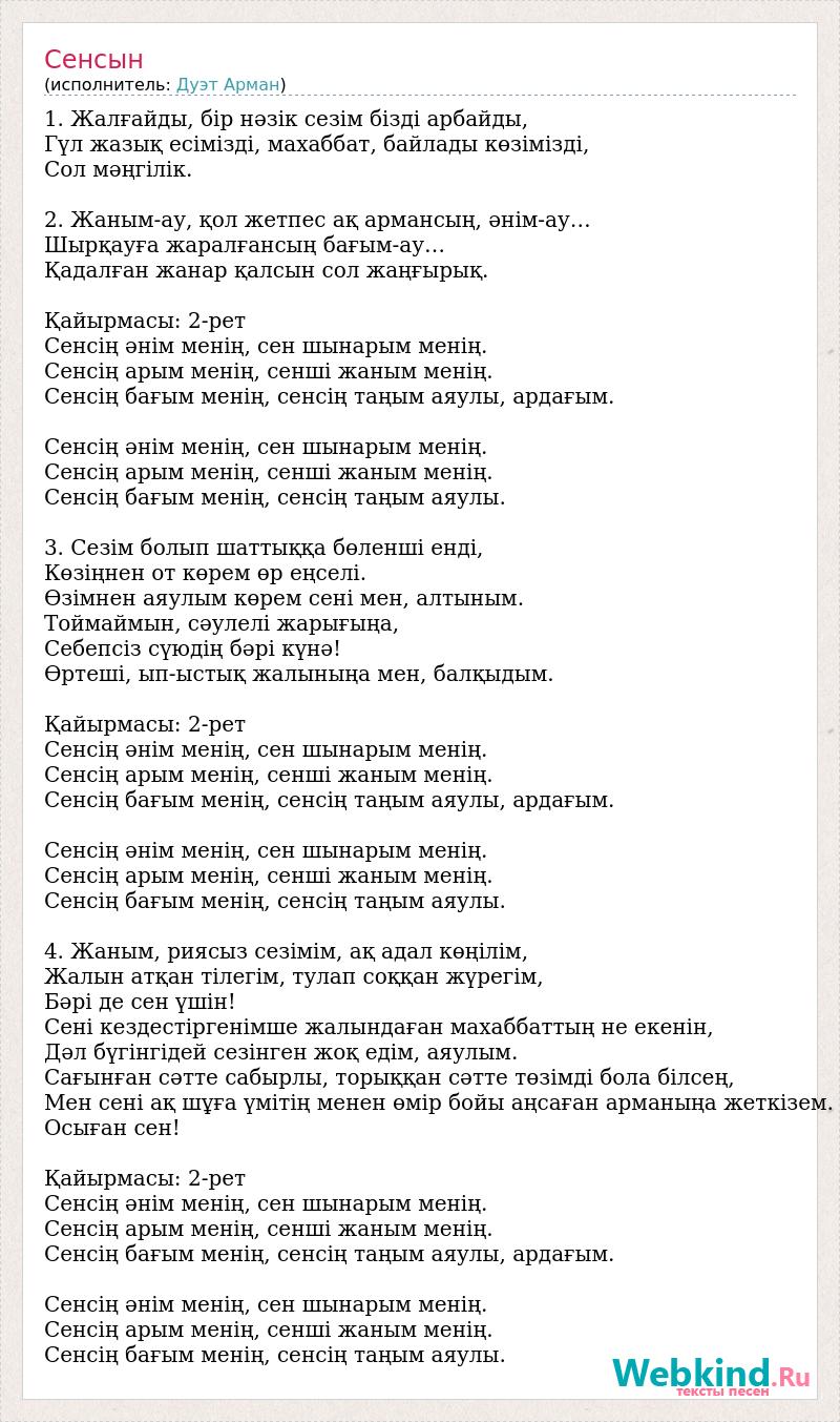 1. Жалғайды, бір нәзік сезім бізді арбайды, Гүл жазық есімізді, махаббат, байлады көзімізді, Сол мәңгілік. 2. Жаным-ау, қол жетпес ақ армансың, әнім-ау… Шырқауға жаралғансың бағым-ау… Қадалған жанар қалсын сол жаңғырық. Қайырмасы: 2-рет Сенсің әнім менің, сен шынарым менің. Сенсің арым менің, сенші жаным менің. Сенсің бағым менің, сенсің таңым аяулы, ардағым. Сенсің әнім менің, сен шынарым менің. Сенсің арым менің, сенші жаным менің. Сенсің бағым менің, сенсің таңым аяулы. 3. Сезім болып шаттыққа бөленші енді, Көзіңнен от көрем өр еңселі. Өзімнен аяулым көрем сені мен, алтыным. Тоймаймын, сәулелі жарығыңа, Себепсіз сүюдің бәрі күнә! Өртеші, ып-ыстық жалыныңа мен, балқыдым. Қайырмасы: 2-рет Сенсің әнім менің, сен шынарым менің. Сенсің арым менің, сенші жаным менің. Сенсің бағым менің, сенсің таңым аяулы, ардағым. Сенсің әнім менің, сен шынарым менің. Сенсің арым менің, сенші жаным менің. Сенсің бағым менің, сенсің таңым аяулы. 4. Жаным, риясыз сезімім, ақ адал көңілім, Жалын атқан тілегім, тулап соққан жүрегім, Бәрі де сен үшін! Сені кездестіргенімше жалындаған махаббаттың не екенін, Дәл бүгінгідей сезінген жоқ едім, аяулым. Сағынған сәтте сабырлы, торыққан сәтте төзімді бола білсең, Мен сені ақ шұға үмітің менен өмір бойы аңсаған арманыңа жеткізем. Осыған сен! Қайырмасы: 2-рет Сенсің әнім менің, сен шынарым менің. Сенсің арым менің, сенші жаным менің. Сенсің бағым менің, сенсің таңым аяулы, ардағым. Сенсің әнім менің, сен шынарым менің. Сенсің арым менің, сенші жаным менің. Сенсің бағым менің, сенсің таңым аяулы.