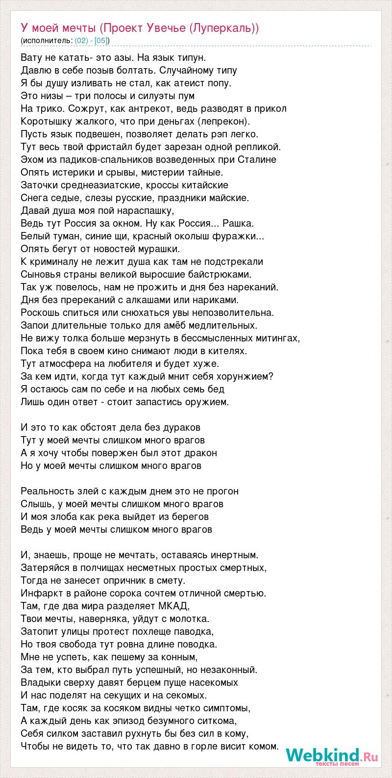 Вату не катать- это азы. На язык типун. Давлю в себе позыв болтать. Случайному типу Я бы душу изливать не стал, как атеист попу. Это низы – три полосы и силуэты пум На трико. Сожрут, как антрекот, ведь разводят в прикол Коротышку жалкого, что при деньгах (лепрекон). Пусть язык подвешен, позволяет делать рэп легко. Тут весь твой фристайл будет зарезан одной репликой. Эхом из падиков-спальников возведенных при Сталине Опять истерики и срывы, мистерии тайные. Заточки среднеазиатские, кроссы китайские Снега седые, слезы русские, праздники майские. Давай душа моя пой нараспашку, Ведь тут Россия за окном. Ну как Россия... Рашка. Белый туман, синие щи, красный околыш фуражки... Опять бегут от новостей мурашки. К криминалу не лежит душа как там не подстрекали Сыновья страны великой выросшие байстрюками. Так уж повелось, нам не прожить и дня без нареканий. Дня без пререканий с алкашами или нариками. Роскошь спиться или снюхаться увы непозволительна. Запои длительные только для амёб медлительных. Не вижу толка больше мерзнуть в бессмысленных митингах, Пока тебя в своем кино снимают люди в кителях. Тут атмосфера на любителя и будет хуже. За кем идти, когда тут каждый мнит себя хорунжием? Я остаюсь сам по себе и на любых семь бед Лишь один ответ - стоит запастись оружием. И это то как обстоят дела без дураков Тут у моей мечты слишком много врагов А я хочу чтобы повержен был этот дракон Но у моей мечты слишком много врагов Реальность злей с каждым днем это не прогон Слышь, у моей мечты слишком много врагов И моя злоба как река выйдет из берегов Ведь у моей мечты слишком много врагов И, знаешь, проще не мечтать, оставаясь инертным. Затеряйся в полчищах несметных простых смертных, Тогда не занесет опричник в смету. Инфаркт в районе сорока сочтем отличной смертью. Там, где два мира разделяет МКАД, Твои мечты, наверняка, уйдут с молотка. Затопит улицы протест похлеще паводка, Но твоя свобода тут ровна длине поводка. Мне не успеть, как пешему за конным, За тем, кто выбрал путь успешный, но незаконный. Владыки сверху давят берцем пуще насекомых И нас поделят на секущих и на секомых. Там, где косяк за косяком видны четко симптомы, А каждый день как эпизод безумного ситкома, Себя силком заставил рухнуть бы без сил в кому, Чтобы не видеть то, что так давно в горле висит комом.