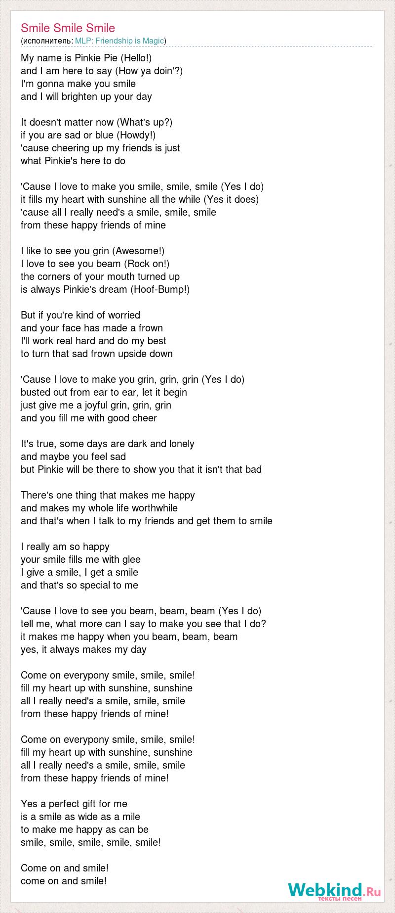 My name is Pinkie Pie (Hello!) and I am here to say (How ya doin'?) I'm gonna make you smile and I will brighten up your day It doesn't matter now (What's up?) if you are sad or blue (Howdy!) 'cause cheering up my friends is just what Pinkie's here to do 'Cause I love to make you smile, smile, smile (Yes I do) it fills my heart with sunshine all the while (Yes it does) 'cause all I really need's a smile, smile, smile from these happy friends of mine I like to see you grin (Awesome!) I love to see you beam (Rock on!) the corners of your mouth turned up is always Pinkie's dream (Hoof-Bump!) But if you're kind of worried and your face has made a frown I'll work real hard and do my best to turn that sad frown upside down 'Cause I love to make you grin, grin, grin (Yes I do) busted out from ear to ear, let it begin just give me a joyful grin, grin, grin and you fill me with good cheer It's true, some days are dark and lonely and maybe you feel sad but Pinkie will be there to show you that it isn't that bad There's one thing that makes me happy and makes my whole life worthwhile and that's when I talk to my friends and get them to smile I really am so happy your smile fills me with glee I give a smile, I get a smile and that's so special to me 'Cause I love to see you beam, beam, beam (Yes I do) tell me, what more can I say to make you see that I do? it makes me happy when you beam, beam, beam yes, it always makes my day Come on everypony smile, smile, smile! fill my heart up with sunshine, sunshine all I really need's a smile, smile, smile from these happy friends of mine! Come on everypony smile, smile, smile! fill my heart up with sunshine, sunshine all I really need's a smile, smile, smile from these happy friends of mine! Yes a perfect gift for me is a smile as wide as a mile to make me happy as can be smile, smile, smile, smile, smile! Come on and smile! come on and smile!