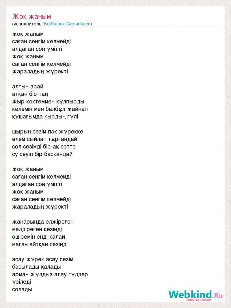 жоқ жаным саған сенгім келмейді алдаған соң үмітті жоқ жаным саған сенгім келмейді жараладың жүректі алтын арай атқан бір таң жыр көктеммен құлпырды келемін мен балбұл жайнап құшағымда қырдың гүлі шырын сезім пәк жүрекке әлем сыйлап тұрғандай сол сезімді бір-ақ сәтте су сеуіп бір басқандай жоқ жаным саған сенгім келмейді алдаған соң үмітті жоқ жаным саған сенгім келмейді жараладың жүректі жанарыңда елжіреген мөлдіреген көзіңді өшіремін енді қалай маған айтқан сөзіңді асау жүрек асау сезім басылады қалады арман жұлдыз алау гүлдер үзіледі солады