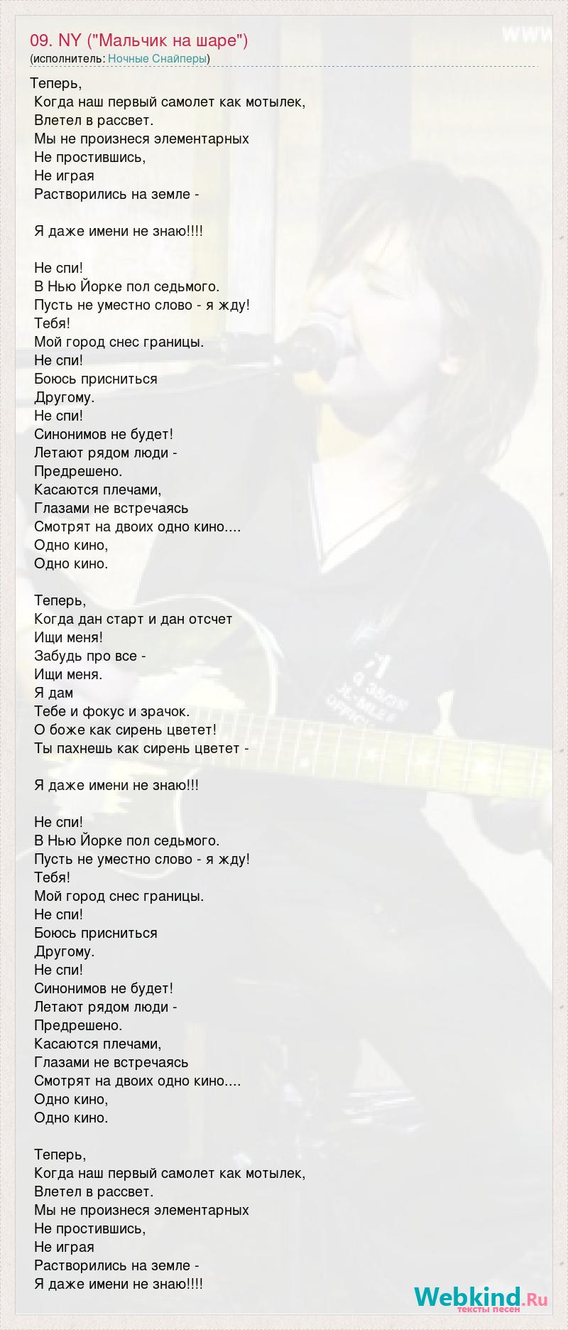Теперь, Когда наш первый самолет как мотылек, Влетел в рассвет. Мы не произнеся элементарных Не простившись, Не играя Растворились на земле - Я даже имени не знаю!!!! Не спи! В Нью Йорке пол седьмого. Пусть не уместно слово - я жду! Тебя! Мой город снес границы. Не спи! Боюсь присниться Другому. Не спи! Синонимов не будет! Летают рядом люди - Предрешено. Касаются плечами, Глазами не встречаясь Смотрят на двоих одно кино.... Одно кино, Одно кино. Теперь, Когда дан старт и дан отсчет Ищи меня! Забудь про все - Ищи меня. Я дам Тебе и фокус и зрачок. О боже как сирень цветет! Ты пахнешь как сирень цветет - Я даже имени не знаю!!! Не спи! В Нью Йорке пол седьмого. Пусть не уместно слово - я жду! Тебя! Мой город снес границы. Не спи! Боюсь присниться Другому. Не спи! Синонимов не будет! Летают рядом люди - Предрешено. Касаются плечами, Глазами не встречаясь Смотрят на двоих одно кино.... Одно кино, Одно кино. Теперь, Когда наш первый самолет как мотылек, Влетел в рассвет. Мы не произнеся элементарных Не простившись, Не играя Растворились на земле - Я даже имени не знаю!!!!