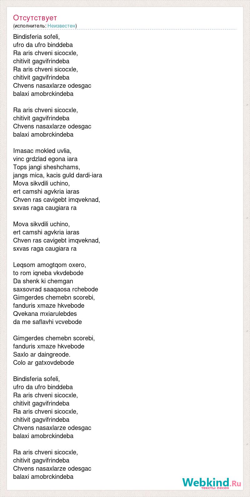 Bindisferia sofeli, ufro da ufro binddeba Ra aris chveni sicocxle, chitivit gagvifrindeba Ra aris chveni sicocxle, chitivit gagvifrindeba Chvens nasaxlarze odesgac balaxi amobrckindeba Ra aris chveni sicocxle, chitivit gagvifrindeba Chvens nasaxlarze odesgac balaxi amobrckindeba Imasac mokled uvlia, vinc grdzlad egona iara Tops jangi sheshchams, jangs mica, kacis guld dardi-iara Mova sikvdili uchino, ert camshi agvkria iaras Chven ras cavigebt imqveknad, sxvas raga caugiara ra Mova sikvdili uchino, ert camshi agvkria iaras Chven ras cavigebt imqveknad, sxvas raga caugiara ra Leqsom amogtqom oxero, to rom iqneba vkvdebode Da shenk ki chemgan saxsovrad saaqaosa rchebode Gimgerdes chemebn scorebi, fanduris xmaze hkvebode Qvekana mxiarulebdes da me saflavhi vcvebode Gimgerdes chemebn scorebi, fanduris xmaze hkvebode Saxlo ar daingreode. Colo ar gatxovdebode Bindisferia sofeli, ufro da ufro binddeba Ra aris chveni sicocxle, chitivit gagvifrindeba Ra aris chveni sicocxle, chitivit gagvifrindeba Chvens nasaxlarze odesgac balaxi amobrckindeba Ra aris chveni sicocxle, chitivit gagvifrindeba Chvens nasaxlarze odesgac balaxi amobrckindeba