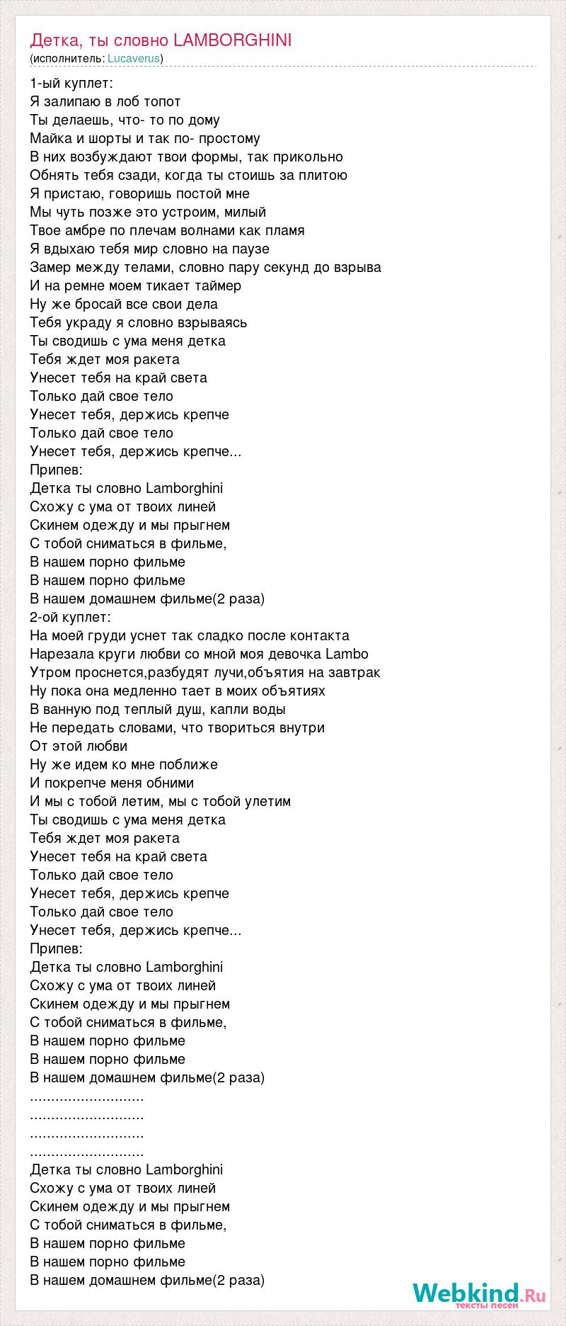 1-ый куплет: Я залипаю в лоб топот Ты делаешь, что- то по дому Майка и шорты и так по- простому В них возбуждают твои формы, так прикольно Обнять тебя сзади, когда ты стоишь за плитою Я пристаю, говоришь постой мне Мы чуть позже это устроим, милый Твое амбре по плечам волнами как пламя Я вдыхаю тебя мир словно на паузе Замер между телами, словно пару секунд до взрыва И на ремне моем тикает таймер Ну же бросай все свои дела Тебя украду я словно взрываясь Ты сводишь с ума меня детка Тебя ждет моя ракета Унесет тебя на край света Только дай свое тело Унесет тебя, держись крепче Только дай свое тело Унесет тебя, держись крепче... Припев: Детка ты словно Lamborghini Схожу с ума от твоих линей Скинем одежду и мы прыгнем С тобой сниматься в фильме, В нашем порно фильме В нашем порно фильме В нашем домашнем фильме(2 раза) 2-ой куплет: На моей груди уснет так сладко после контакта Нарезала круги любви со мной моя девочка Lambo Утром проснется,разбудят лучи,объятия на завтрак Ну пока она медленно тает в моих объятиях В ванную под теплый душ, капли воды Не передать словами, что твориться внутри От этой любви Ну же идем ко мне поближе И покрепче меня обними И мы с тобой летим, мы с тобой улетим Ты сводишь с ума меня детка Тебя ждет моя ракета Унесет тебя на край света Только дай свое тело Унесет тебя, держись крепче Только дай свое тело Унесет тебя, держись крепче... Припев: Детка ты словно Lamborghini Схожу с ума от твоих линей Скинем одежду и мы прыгнем С тобой сниматься в фильме, В нашем порно фильме В нашем порно фильме В нашем домашнем фильме(2 раза) ........................... ........................... ........................... ........................... Детка ты словно Lamborghini Схожу с ума от твоих линей Скинем одежду и мы прыгнем С тобой сниматься в фильме, В нашем порно фильме В нашем порно фильме В нашем домашнем фильме(2 раза)