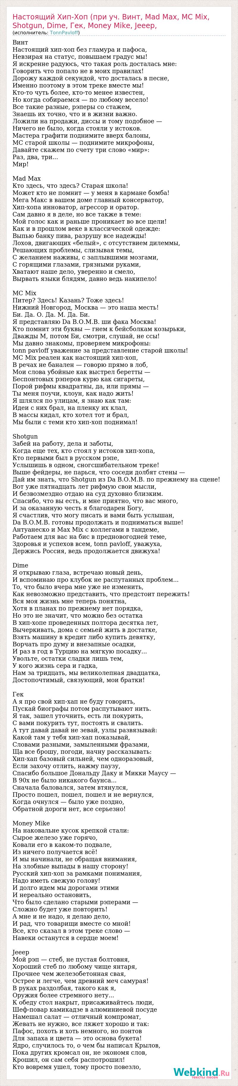 Винт Настоящий хип-хоп без гламура и пафоса, Невзирая на статус, повышаем градус мы! Я искренне радуюсь, что такая роль досталась мне: Говорить что попало не в моих правилах! Дорожу каждой секундой, что досталась в песне, Именно поэтому в этом треке вместе мы! Кто-то чуть более, кто-то менее известен, Но когда собираемся — по любому весело! Все такие разные, рэперы со стажем, Знаешь их точно, что и в жизни важно. Ложили на продажи, диссы и тому подобное — Ничего не было, когда стояли у истоков. Мастера графити поднимите вверх балоны, МС старой школы — поднимите микрофоны, Давайте скажем по счету три слово «мир»: Раз, два, три... Мир! Mad Max Кто здесь, что здесь? Старая школа! Может кто не помнит — у меня в кармане бомба! Мега Макс в вашем доме главный консерватор, Хип-хопа инноватор, агрессор и оратор. Сам давно я в деле, но все также в теме: Мой голос как и раньше проникает во все щели! Как и в прошлом веке в классической одежде: Выпью банку пива, разрушу все надежды! Лохов, двигающих «белый», с отсутствием дилеммы, Решающих проблемы, слизывая темы, С желанием наживы, с заплывшими мозгами, С горящими глазами, грязными руками, Хватают наше дело, уверенно и смело, Вырвать языки блядям, давно ведь накипело! MC Mix Питер? Здесь! Казань? Тоже здесь! Нижний Новгород, Москва — это наша месть! Би. Да. О. Да. М. Да. Би. Я представляю Da B.O.M.B. ши фака Москва! Кто помнит эти буквы — гнем к бейсболкам козырьки, Дважды М, потом Би, смотри, слушай, не ссы! Мы давно знакомы, проверяем микрофоны: tonn pavloff уважение за представление старой школы! MC Mix реален как настоящий хип-хоп, В речах не банален — говорю прямо в лоб, Мои слова убойные как выстрел беретты — Беспонтовых рэперов курю как сигареты, Порой рифмы квадратны, да, или прямы — Ты меня поучи, клоун, как надо жить! Я шлялся по улицам, я знаю как там: Идеи с них брал, на пленку их клал, В массы кидал, кто хотел тот и брал, Мы были с теми кто хип-хоп поднимал! Shotgun Забей на работу, дела и заботы, Когда еще тех, кто стоял у истоков хип-хопа, Кто первыми был в русском рэпе, Услышишь в одном, сногсшибательном треке! Выше фейдеры, не парься, что соседи долбят стены — Дай им знать, что Shotgun из Da B.O.M.B. по прежнему на сцене! Вот уже пятнадцать лет рифмую свои мысли, И безвозмездно отдаю на суд духовно близким. Спасибо, что вы есть, и мне приятно, что вас много, И за оказанную честь я благодарен Богу, Я счастлив, что могу писать и вами быть услышан, Da B.O.M.B. готовы продолжать и подниматься выше! Антуанеско и Max Mix с коллегами в тандеме, Работаем для вас на бис в предновогодней теме, Здоровья и успехов всем, tonn pavloff, уважуха, Держись Россия, ведь продолжается движуха! Dime Я открываю глаза, встречаю новый день, И вспоминаю про клубок не распутанных проблем... То, что было вчера мне уже не изменить, Как невозможно представить, что предстоит пережить! Вся моя жизнь мне теперь понятна, Хотя в планах по прежнему нет порядка, Но это не значит, что можно без остатка В хип-хопе проведенных полтора десятка лет, Вычеркивать, дома с семьей жить в достатке, Взять машину в кредит либо купить девятку, Ворчать про думу и внезапные осадки, И раз в год в Турцию на мягкую посадку... Увольте, остатки сладки лишь тем, У кого жизнь сера и гадка, Нам за тридцать, мы великолепная двадцатка, Достопочтимый, связующий, мои братки! Гек А я про свой хип-хап не буду говорить, Пускай биографы потом распутывают н