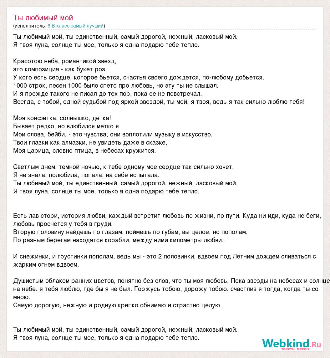 Ты любимый мой, ты единственный, самый дорогой, нежный, ласковый мой. Я твоя луна, солнце ты мое, только я одна подарю тебе тепло. Красотою неба, романтикой звезд, это композиция - как букет роз. У кого есть сердце, которое бьется, счастья своего дождется, по-любому добьется. 1000 строк, песен 1000 было спето про любовь, но эту ты не слышал. И я прежде такого не писал до тех пор, пока ее не повстречал. Всегда, с тобой, одной судьбой под яркой звездой, ты мой, я твоя, ведь я так сильно люблю тебя! Моя конфетка, солнышко, детка! Бывает редко, но влюбился метко я. Мои слова, бейби, - это чувства, они воплотили музыку в искусство. Твои глазки как алмазки, не увидеть даже в сказке, Моя царица, словно птица, в небесах кружится. Светлым днем, темной ночью, к тебе одному мое сердце так сильно хочет. Я не знала, полюбила, попала, на себе испытала. Ты любимый мой, ты единственный, самый дорогой, нежный, ласковый мой. Я твоя луна, солнце ты мое, только я одна подарю тебе тепло. Есть лав стори, история любви, каждый встретит любовь по жизни, по пути. Куда ни иди, куда не беги, любовь проснется у тебя в груди. Вторую половину найдешь по глазам, поймешь по губам, вы целое, но пополам, По разным берегам находятся корабли, между ними километры любви. И снежинки, и грустинки пополам, ведь мы - это 2 половинки, вдвоем под Летним дождем сливаться с жарким огнем вдвоем. Душистым облаком ранних цветов, понятно без слов, что ты моя любовь, Пока звезды на небесах и солнце на небе. я тебя люблю, где бы я не был. Горжусь тобою, дорожу тобою. счастлив я тогда, когда ты со мною. Самую дорогую, нежную и родную крепко обнимаю и страстно целую. Ты любимый мой, ты единственный, самый дорогой, нежный, ласковый мой. Я твоя луна, солнце ты мое, только я одна подарю тебе тепло.