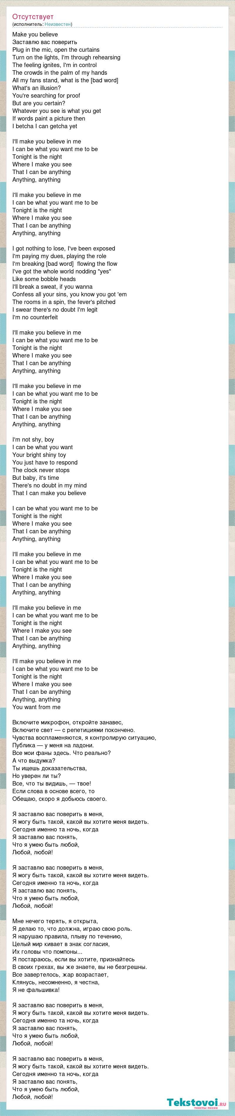 Make you believe Заставлю вас поверить Plug in the mic, open the curtains Turn on the lights, I'm through rehearsing The feeling ignites, I'm in control The crowds in the palm of my hands All my fans stand, what is the truth? What's an illusion? You're searching for proof But are you certain? Whatever you see is what you get If words paint a picture then I betcha I can getcha yet I'll make you believe in me I can be what you want me to be Tonight is the night Where I make you see That I can be anything Anything, anything I'll make you believe in me I can be what you want me to be Tonight is the night Where I make you see That I can be anything Anything, anything I got nothing to lose, I've been exposed I'm paying my dues, playing the role I'm breaking the rules, flowing the flow I've got the whole world nodding "yes" Like some bobble heads I'll break a sweat, if you wanna Confess all your sins, you know you got 'em The rooms in a spin, the fever's pitched I swear there's no doubt I'm legit I'm no counterfeit I'll make you believe in me I can be what you want me to be Tonight is the night Where I make you see That I can be anything Anything, anything I'll make you believe in me I can be what you want me to be Tonight is the night Where I make you see That I can be anything Anything, anything I'm not shy, boy I can be what you want Your bright shiny toy You just have to respond The clock never stops But baby, it's time There's no doubt in my mind That I can make you believe I can be what you want me to be Tonight is the night Where I make you see That I can be anything Anything, anything I'll make you believe in me I can be what you want me to be Tonight is the night Where I make you see That I can be anything Anything, anything I'll make you believe in me I can be what you want me to be Tonight is the night Where I make you see That I can be anything Anything, anything I'll make you believe in me I can be what you want me to be Tonight is the night Where I make you see That I can be anything Anything, anything You want from me Включите микрофон, откройте занавес, Включите свет — с репетициями покончено. Чувства воспламеняются, я контролирую ситуацию, Публика — у меня на ладони. Все мои фаны здесь. Что реально? А что выдумка? Ты ищешь доказательства, Но уверен ли ты? Все, что ты видишь, — твое! Если слова в основе всего, то Обещаю, скоро я добьюсь своего. Я заставлю вас поверить в меня, Я могу быть такой, какой вы хотите меня видеть. Сегодня именно та ночь, когда Я заставлю вас понять, Что я умею быть любой, Любой, любой! Я заставлю вас поверить в меня, Я могу быть такой, какой вы хотите меня видеть. Сегодня именно та ночь, когда Я заставлю вас понять, Что я умею быть любой, Любой, любой! Мне нечего терять, я открыта, Я делаю то, что должна, играю свою роль. Я нарушаю правила, плыву по течению, Целый мир кивает в знак согласия, Их головы что помпоны... Я постараюсь, если вы хотите, признайтесь В своих грехах, вы же знаете, вы не безгрешны. Все завертелось, жар возрастает, Клянусь, несомненно, я честна, Я не фальшивка! Я заставлю вас поверить в меня, Я могу быть такой, какой вы хотите меня видеть. Сегодня именно та ночь, когда Я заставлю вас понять, Что я умею быть любой, Любой, любой! Я заставлю вас поверить в меня, Я могу быть такой, какой вы хотите меня видеть. Сегодня именно та ночь, когда Я заставлю вас понять, Что я умею быть любой, Любой, любой!