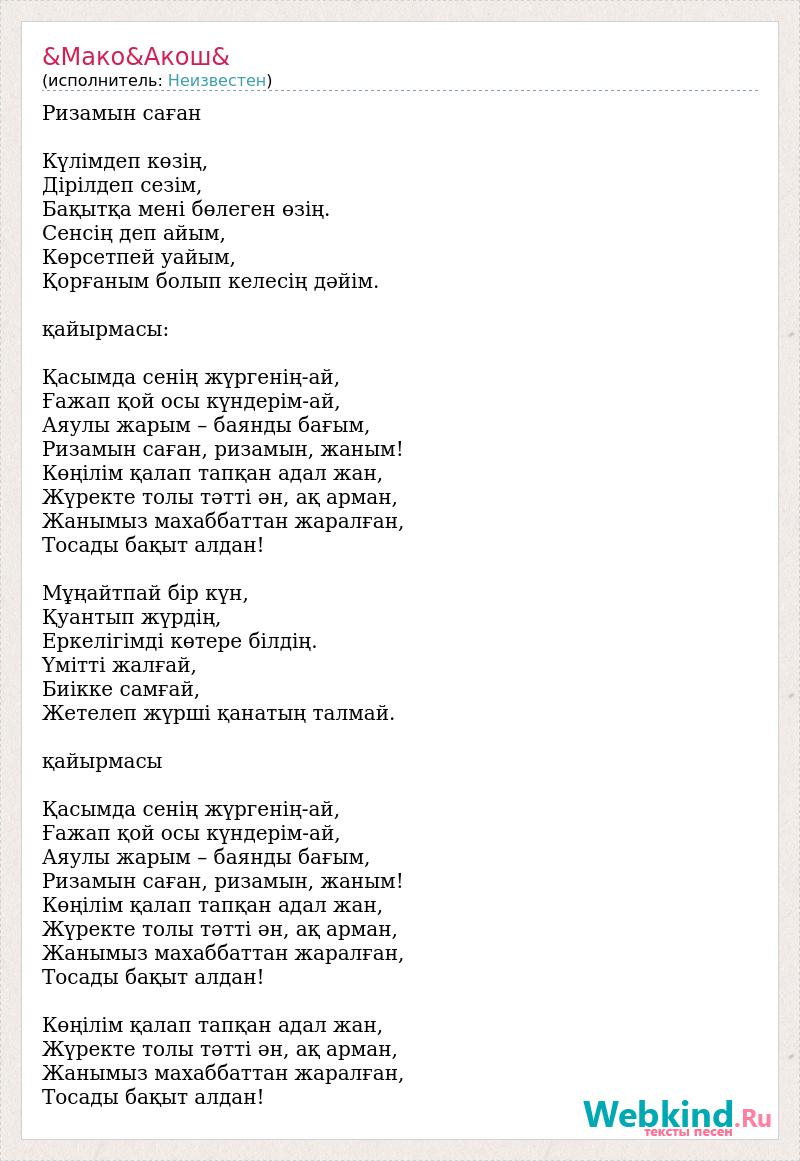 Ризамын саған Күлімдеп көзің, Дірілдеп сезім, Бақытқа мені бөлеген өзің. Сенсің деп айым, Көрсетпей уайым, Қорғаным болып келесің дәйім. қайырмасы: Қасымда сенің жүргенің-ай, Ғажап қой осы күндерім-ай, Аяулы жарым – баянды бағым, Ризамын саған, ризамын, жаным! Көңілім қалап тапқан адал жан, Жүректе толы тәтті ән, ақ арман, Жанымыз махаббаттан жаралған, Тосады бақыт алдан! Мұңайтпай бір күн, Қуантып жүрдің, Еркелігімді көтере білдің. Үмітті жалғай, Биікке самғай, Жетелеп жүрші қанатың талмай. қайырмасы Қасымда сенің жүргенің-ай, Ғажап қой осы күндерім-ай, Аяулы жарым – баянды бағым, Ризамын саған, ризамын, жаным! Көңілім қалап тапқан адал жан, Жүректе толы тәтті ән, ақ арман, Жанымыз махаббаттан жаралған, Тосады бақыт алдан! Көңілім қалап тапқан адал жан, Жүректе толы тәтті ән, ақ арман, Жанымыз махаббаттан жаралған, Тосады бақыт алдан!