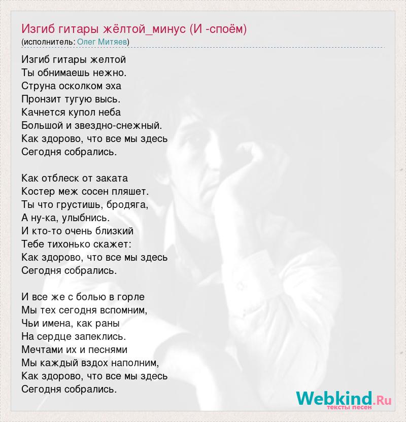 Изгиб гитары желтой Ты обнимаешь нежно. Струна осколком эха Пронзит тугую высь. Качнется купол неба Большой и звездно-снежный. Как здорово, что все мы здесь Сегодня собрались. Как отблеск от заката Костер меж сосен пляшет. Ты что грустишь, бродяга, А ну-ка, улыбнись. И кто-то очень близкий Тебе тихонько скажет: Как здорово, что все мы здесь Сегодня собрались. И все же с болью в горле Мы тех сегодня вспомним, Чьи имена, как раны На сердце запеклись. Мечтами их и песнями Мы каждый вздох наполним, Как здорово, что все мы здесь Сегодня собрались.