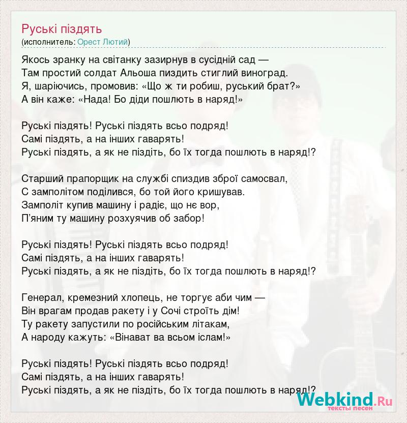 Якось зранку на світанку зазирнув в сусідній сад — Там простий солдат Альоша пиздить стиглий виноград. Я, шаріючись, промовив: «Що ж ти робиш, руський брат?» А він каже: «Нада! Бо діди пошлють в наряд!» Руські піздять! Руські піздять всьо подряд! Самі піздять, а на інших гаварять! Руські піздять, а як не піздіть, бо їх тогда пошлють в наряд!? Старший прапорщик на службі спиздив зброї самосвал, С замполітом поділився, бо той його кришував. Замполіт купив машину і радіє, що нє вор, П’яним ту машину розхуячив об забор! Руські піздять! Руські піздять всьо подряд! Самі піздять, а на інших гаварять! Руські піздять, а як не піздіть, бо їх тогда пошлють в наряд!? Генерал, кремезний хлопець, не торгує аби чим — Він врагам продав ракету і у Сочі строїть дім! Ту ракету запустили по російським літакам, А народу кажуть: «Вінават ва всьом іслам!» Руські піздять! Руські піздять всьо подряд! Самі піздять, а на інших гаварять! Руські піздять, а як не піздіть, бо їх тогда пошлють в наряд!?