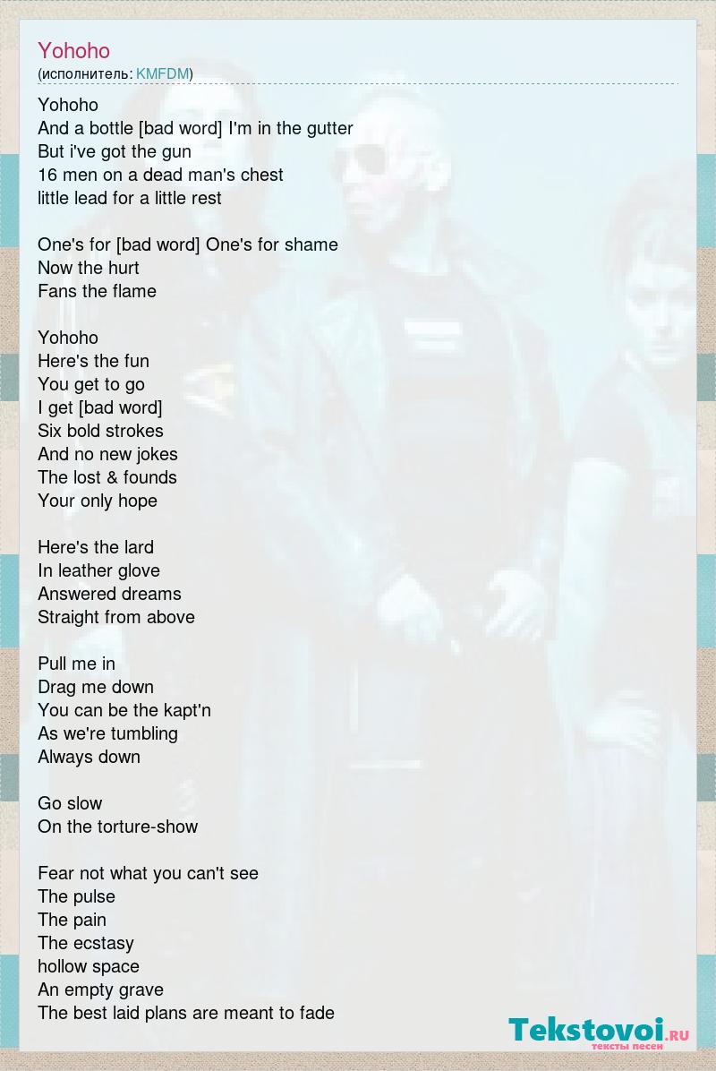 Yohoho And a bottle of rum I'm in the gutter But i've got the gun 16 men on a dead man's chest little lead for a little rest One's for [bad word] One's for shame Now the hurt Fans the flame Yohoho Here's the fun You get to go I get to come Six bold strokes And no new jokes The lost & founds Your only hope Here's the lard In leather glove Answered dreams Straight from above Pull me in Drag me down You can be the kapt'n As we're tumbling Always down Go slow On the torture-show Fear not what you can't see The pulse The pain The ecstasy hollow space An empty grave The best laid plans are meant to fade