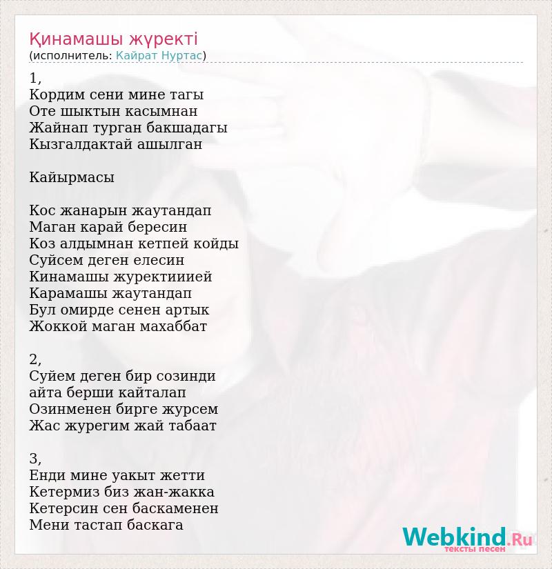 1, Кордим сени мине тагы Оте шыктын касымнан Жайнап турган бакшадагы Кызгалдактай ашылган Кайырмасы Кос жанарын жаутандап Маган карай бересин Коз алдымнан кетпей койды Суйсем деген елесин Кинамашы журектииией Карамашы жаутандап Бул омирде сенен артык Жоккой маган махаббат 2, Суйем деген бир созинди айта берши кайталап Озинменен бирге журсем Жас журегим жай табаат 3, Енди мине уакыт жетти Кетермиз биз жан-жакка Кетерсин сен баскаменен Мени тастап баскага