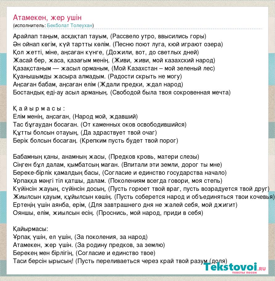 Арайлап таңым, асқақтап тауым, (Рассвело утро, ввысились горы) Ән ойнап көгім, күй тартты көлім. (Песню поют луга, кюй играют озера) Қол жетті, міне, аңсаған күнге, (Дожили, вот, до светлых дней) Жасай бер, жаса, қазағым менің. (Живи, живи, мой казахский народ) Қазақстаным — жасыл орманым, (Мой Казахстан – мой зеленый лес) Қуанышымды жасыра алмадым. (Радости скрыть не могу) Аңсаған бабам, аңсаған елім (Ждали предки, ждал народ) Бостандық еді-ау асыл арманың. (Свободой была твоя сокровенная мечта) Қ а й ы р м а с ы : Елім менің, аңсаған, (Народ мой, ждавший) Тас бұғаудан босаған. (От каменных оков освободившийся) Құтты болсын отауың, (Да здраствует твой очаг) Берік болсын босағаң. (Крепким пусть будет твой порог) Бабамның қаны, анамның жасы, (Предков кровь, матери слезы) Сіңген бұл далам, қымбатсың маған. (Впитали эти земли, дорог ты мне) Береке-бірлік қамалдың басы, (Согласие и единство государства начало) Ұрпаққа мәңгі тіл қатшы, далам. (Поколениям всегда говори, моя степь) Күйінсін жауың, сүйінсін досың, (Пусть горюет твой враг, пусть возрадуется твой друг) Жиылсын қауым, құйылсын көшің. (Пусть соберется народ и объединяться твои кочевья) Ертеңің үшін аянба, ерім, (Для завтрашнего дня не жалей себя, мой джигит) Ояншы, елім, жиылсын есің. (Проснись, мой народ, приди в себя) Қайырмасы: Ұрпақ үшін, ел үшін, (За поколения, за народ) Атамекен, жер үшін. (За родину предков, за землю) Берекең мен бірлігің, (Согласие и единство твое) Таси берсін ырысың! (Пусть переливаеться через край твой разум (доля)