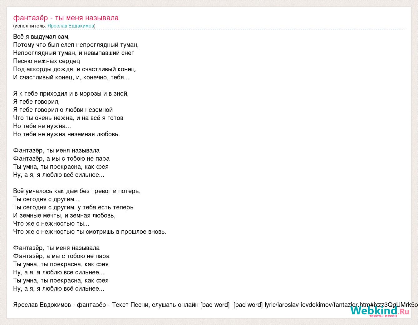 Всё я выдумал сам, Потому что был слеп непроглядный туман, Непроглядный туман, и невыпавший снег Песню нежных сердец Под аккорды дождя, и счастливый конец, И счастливый конец, и, конечно, тебя... Я к тебе приходил и в морозы и в зной, Я тебе говорил, Я тебе говорил о любви неземной Что ты очень нежна, и на всё я готов Но тебе не нужна... Но тебе не нужна неземная любовь. Фантазёр, ты меня называла Фантазёр, а мы с тобою не пара Ты умна, ты прекрасна, как фея Ну, а я, я люблю всё сильнее... Всё умчалось как дым без тревог и потерь, Ты сегодня с другим... Ты сегодня с другим, у тебя есть теперь И земные мечты, и земная любовь, Что же с нежностью ты... Что же с нежностью ты смотришь в прошлое вновь. Фантазёр, ты меня называла Фантазёр, а мы с тобою не пара Ты умна, ты прекрасна, как фея Ну, а я, я люблю всё сильнее... Ты умна, ты прекрасна, как фея Ну, а я, я люблю всё сильнее... Ярослав Евдокимов - фантазёр - Текст Песни, слушать онлайн [bad word] [bad word] lyric/iaroslav-ievdokimov/fantazior.htm#ixzz3QgUMrk5o