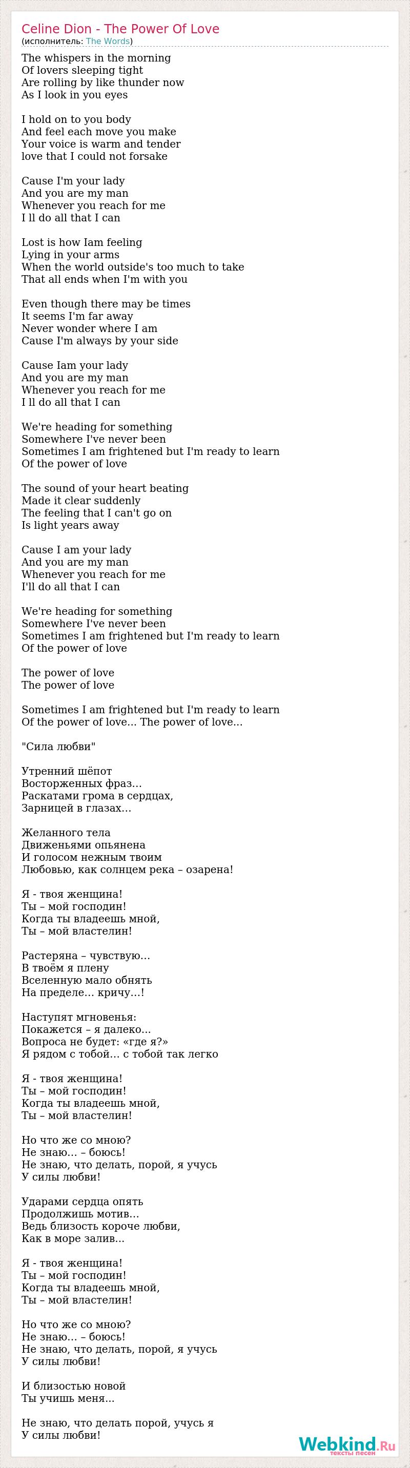 The whispers in the morning Of lovers sleeping tight Are rolling by like thunder now As I look in you eyes I hold on to you body And feel each move you make Your voice is warm and tender love that I could not forsake Cause I'm your lady And you are my man Whenever you reach for me I ll do all that I can Lost is how Iаm feeling Lying in your arms When the world outside's too much to take That all ends when I'm with you Even though there may be times It seems I'm far away Never wonder where I am Cause I'm always by your side Cause Iаm your lady And you are my man Whenever you reach for me I ll do all that I can We're heading for something Somewhere I've never been Sometimes I am frightened but I'm ready to learn Of the power of love The sound of your heart beating Made it clear suddenly The feeling that I can't go on Is light years away Cause I аm your lady And you are my man Whenever you reach for me I'll do all that I can We're heading for something Somewhere I've never been Sometimes I am frightened but I'm ready to learn Of the power of love The power of love The power of love Sometimes I am frightened but I'm ready to learn Of the power of love... The power of love... "Сила любви" Утренний шёпот Восторженных фраз… Раскатами грома в сердцах, Зарницей в глазах… Желанного тела Движеньями опьянена И голосом нежным твоим Любовью, как солнцем река – озарена! Я - твоя женщина! Ты – мой господин! Когда ты владеешь мной, Ты – мой властелин! Растеряна – чувствую… В твоём я плену Вселенную мало обнять На пределе… кричу…! Наступят мгновенья: Покажется – я далеко... Вопроса не будет: «где я?» Я рядом с тобой… с тобой так легко Я - твоя женщина! Ты – мой господин! Когда ты владеешь мной, Ты – мой властелин! Но что же со мною? Не знаю… – боюсь! Не знаю, что делать, порой, я учусь У силы любви! Ударами сердца опять Продолжишь мотив… Ведь близость короче любви, Как в море залив... Я - твоя женщина! Ты – мой господин! Когда ты владеешь мной, Ты – мой властелин! Но что же со мною? Не знаю… – боюсь! Не знаю, что делать, порой, я учусь У силы любви! И близостью новой Ты учишь меня... Не знаю, что делать порой, учусь я У силы любви!